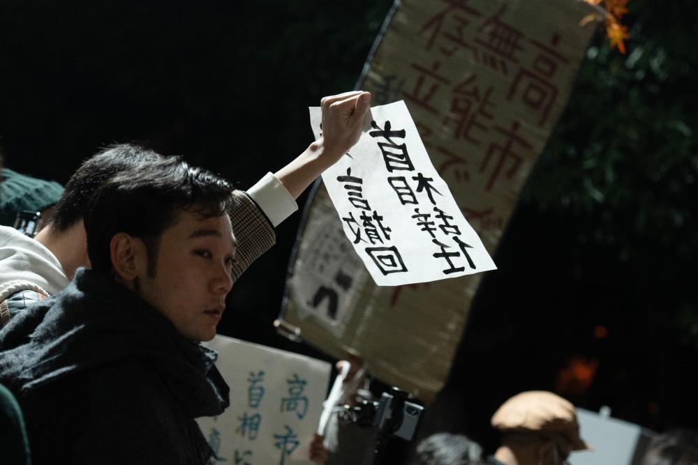 11月21日,在日本东京的首相官邸外,民众举起标语参加抗议活动。新华社发