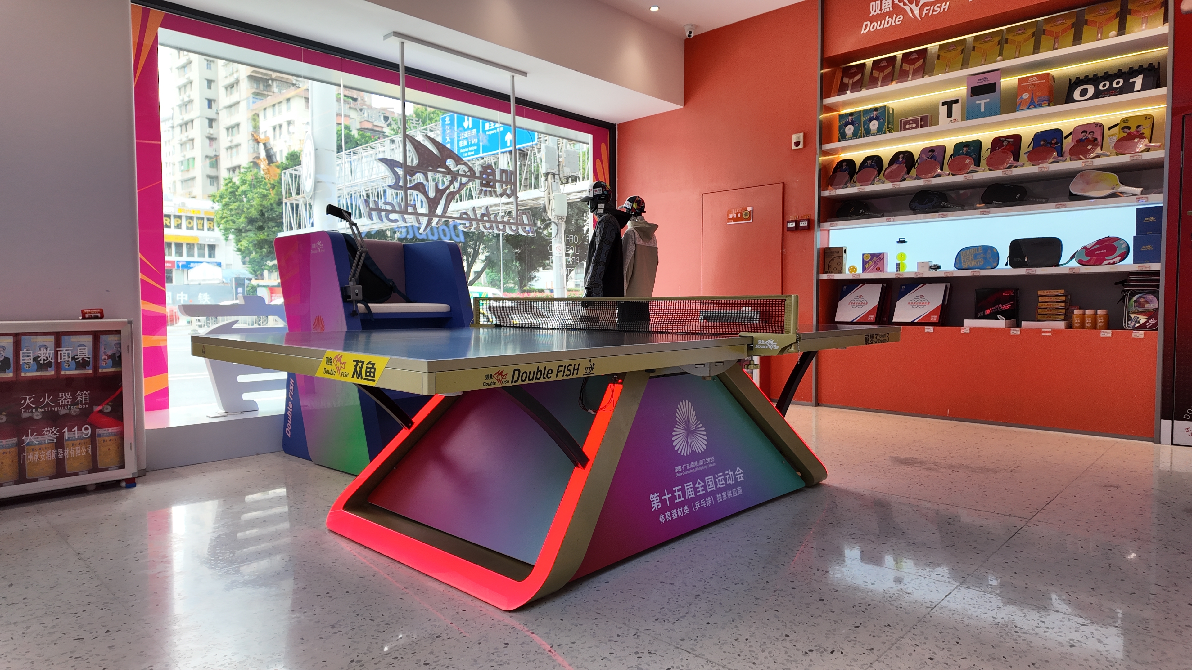 当乒乓球在球拍之间旋转、跳跃、击打出清脆弧线时,它每次的落点都在蓝色的球台上,发出清脆的回响。桥梁式的台架撑起一整片蓝色台面,边缘那圈U型灯带像一条发光的“河”。