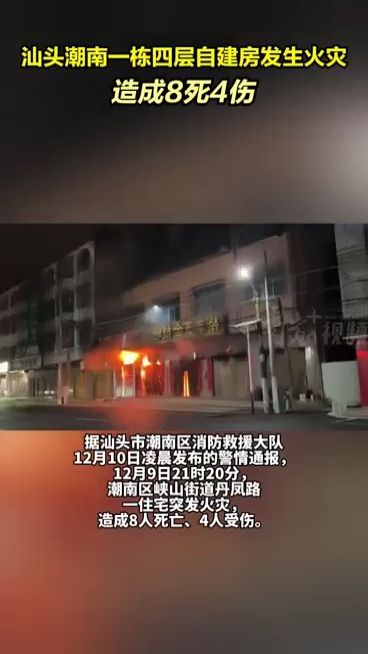 据广东省汕头市潮南区消防救援大队10日凌晨发布的警情通报,9日21时20分,潮南区峡山街道丹凤路一住宅突发火灾,造成8人死亡。
