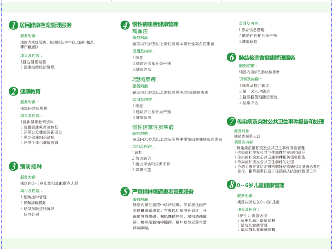 1.居民健康档案管理:为你建一份“健康账本”,记录身体变化;2.健康教育:传授健康知识,远离疾病误区;3.预防接种:筑起免疫屏障;4.慢性病患者健康管理:帮高血压、糖尿病、慢阻肺患者控病情、少遭罪;5.严重精神障碍患者管理服务:为特殊群体送上专业照料;6.肺结核患者健康管理服务:全程跟踪治疗,助患者康复;7.传染病及突发公共卫生事件报告和处理:早发现、早应对,守住健康防线;8.0-6岁儿童健康管理:从出生到入学,呵护孩子成长;9.孕产妇健康管理:为准妈妈保驾护航,迎接新生命;10.老年人健康管理服务:每年免费体检,让老人安享晚年;11.中医药健康管理服务:用传统中医智慧守护健康;12.卫生监督协管:帮大家盯紧身边的卫生安全。