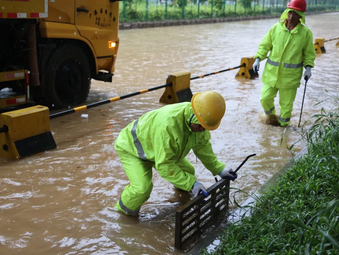 在凤观路与永盛大街交汇路段,大量雨水携带的泥沙和杂物涌入,造成排水口堵塞,导致该路段出现一条长约百米、深约30厘米的积水区域。现场工作人员冒雨作业,迅速将折断的树枝等大型杂物清离路面,并手持专业工具,仔细清理每一个排水口的淤泥,并动用管道疏通车进行高压清淤,进一步提升了排水效率。