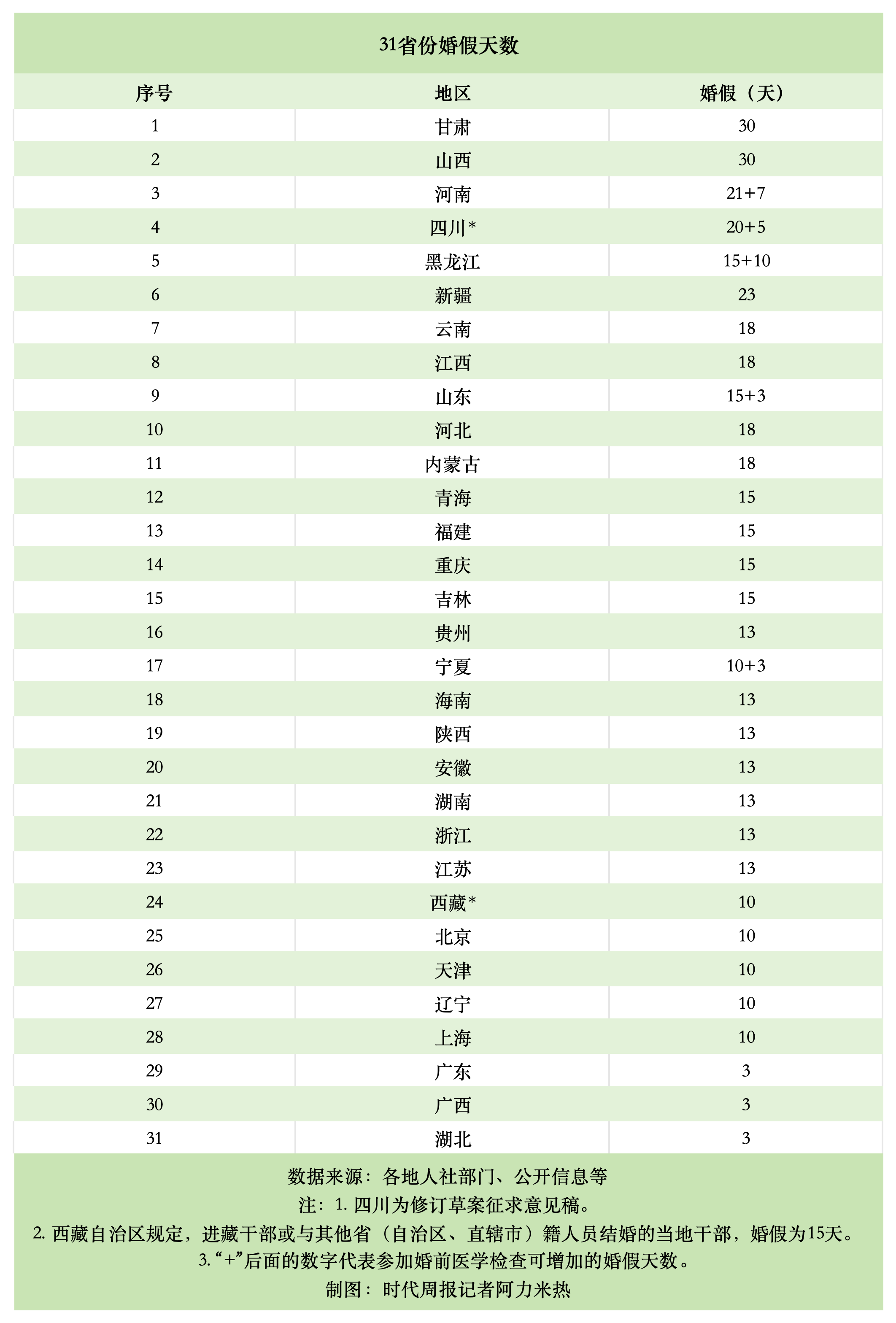 据时代周报记者梳理,目前已有27个省份在地方性法规中明确延长婚假。如今,四川也开始向社会公开征求延长婚假、生育假等意见。