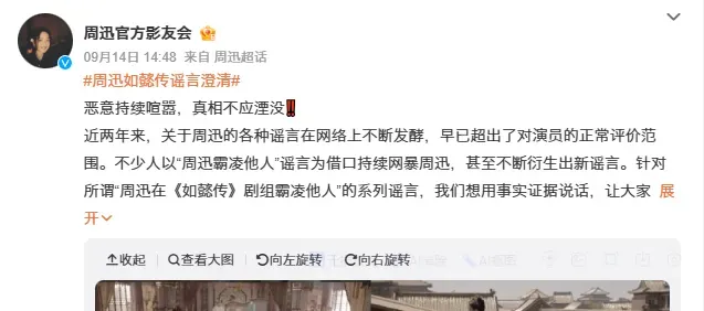 9月15日,话题“周迅如懿传谣言澄清”登上热搜。@周迅官方影友会 发文称:恶意持续喧嚣,真相不应湮没!近两年来,关于周迅的各种谣言在网络上不断发酵,早已超出了对演员的正常评价范围。不少人以“周迅霸凌他人”谣言为借口持续网暴周迅,甚至不断衍生出新谣言。一个邀请剧组工作人员上自己房车休息、在场务丢钱后塞上几千块红包安慰的人,不应该被污蔑为“剧组霸凌者”。详情>>