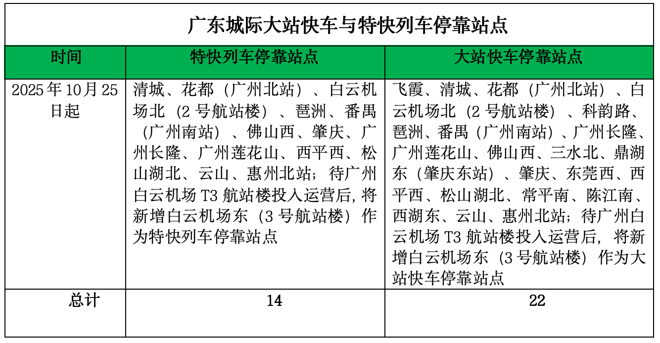 为满足各城市核心区与交通枢纽间的快速直达,结合旅客反映的候车与乘车时间情况,广东城际通过调整长距离交路、优化列车停站时间,进一步提升运输效率。启用新版运行图后,广东城际每日将开行列车239列次,较此前增加56列次,整体运能提升31%。