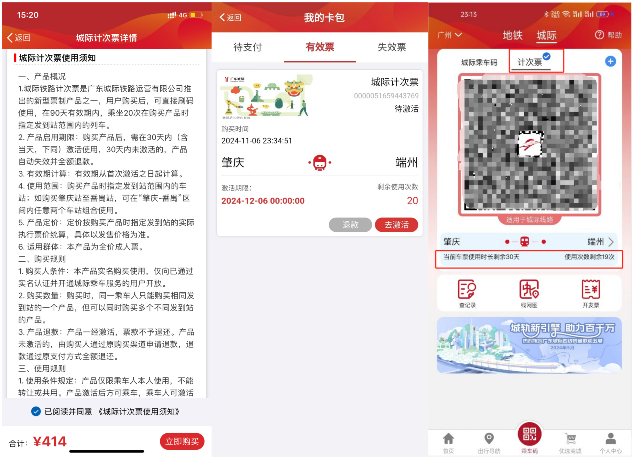 优惠票包括20次“计次票”和30日“定期票”,其中,“计次票”适合3个月内往返不超过20次的旅客,购买后90日内可乘坐20次指定发到站范围内的往返列车;“定期票”更适合1个月内通勤超过34次的旅客,购买后30日内可乘坐42次指定发到站范围内的往返列车。例如购买“肇庆-番禺”优惠票后,可在该区间任意两站乘车,出行更灵活。
