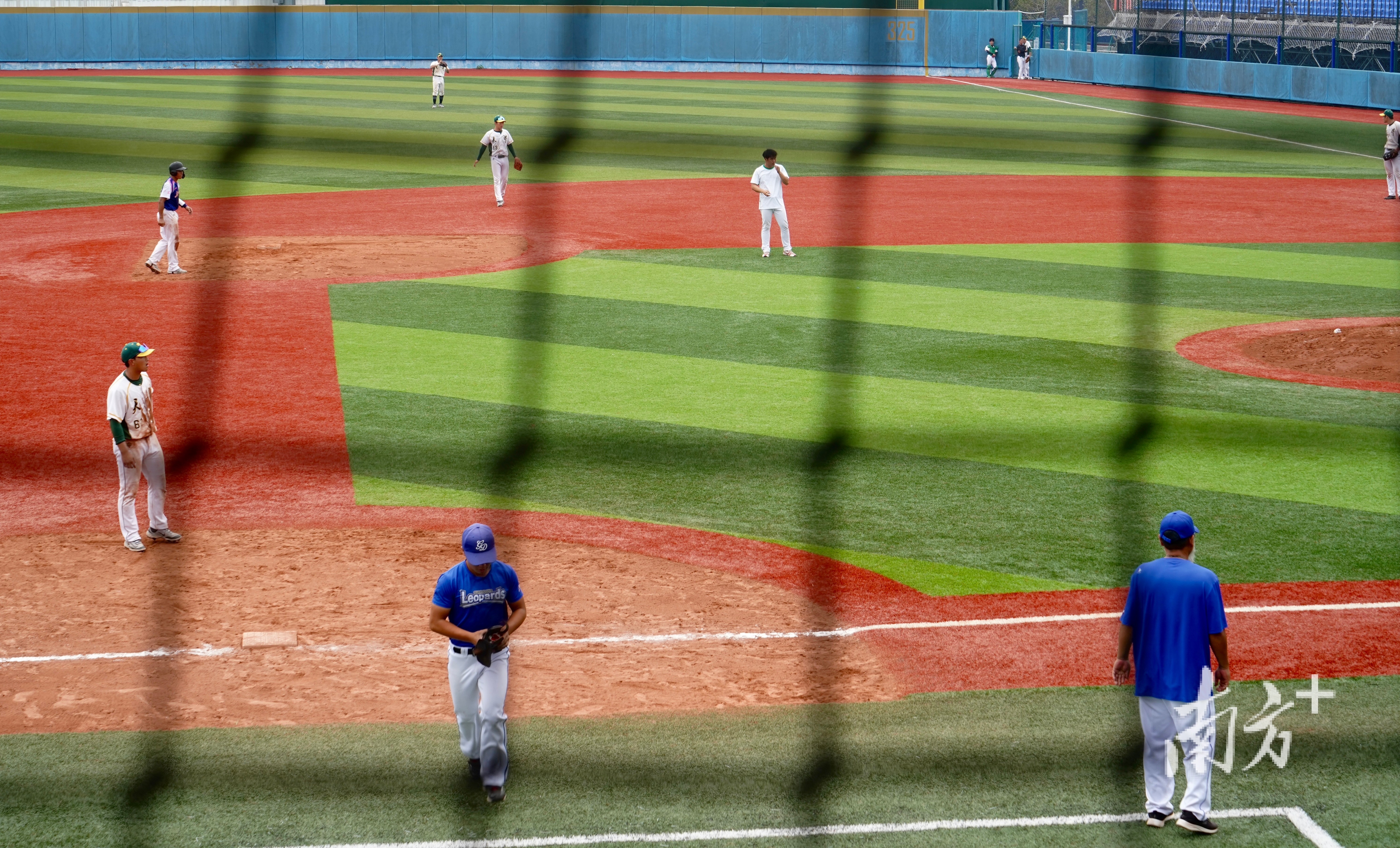 身着蓝色队服的广东队正在与天津队进行棒球训练赛。