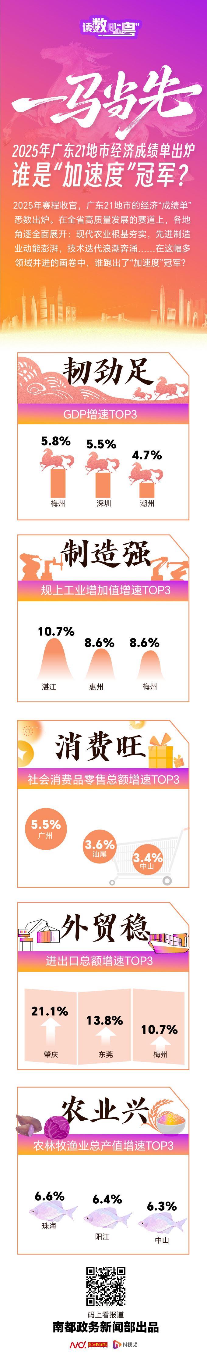 与2024年相比,梅州、潮州、湛江及广州等地市2025年的GDP增速跑出加速度,其中,湛江及广州两个地市均从低于全省水平提升至超越全省水平。