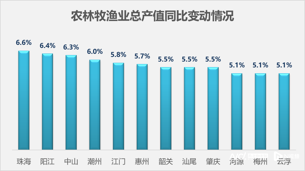 增速方面,珠海、阳江、中山、潮州等12个地市农林牧渔业总产值高于全省水平(4.9%)。