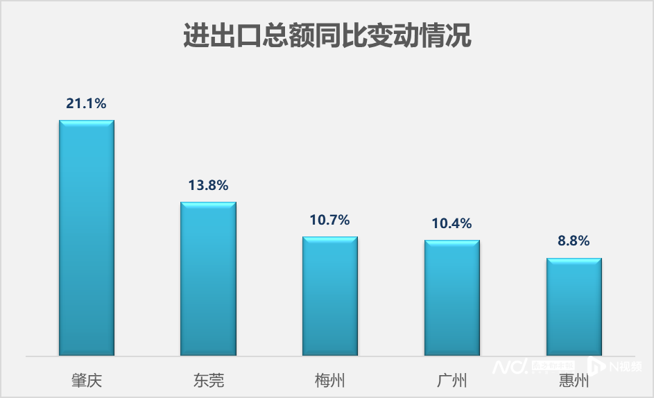 从增速来看,肇庆、东莞、梅州、广州及惠州5个地市进出口总额增速高于全省水平(4.4%)。