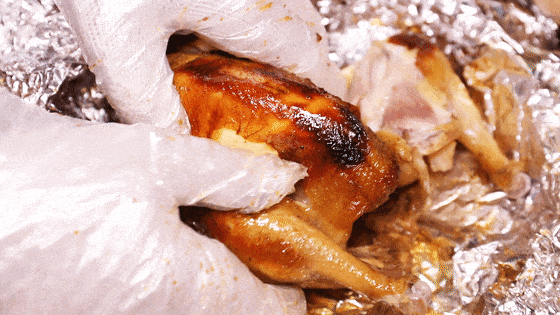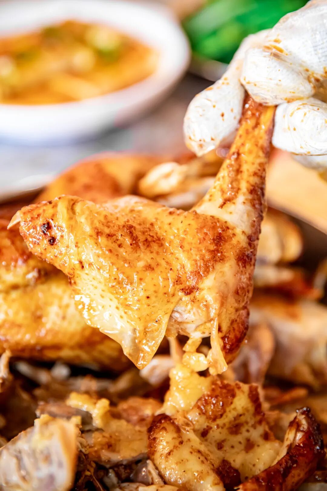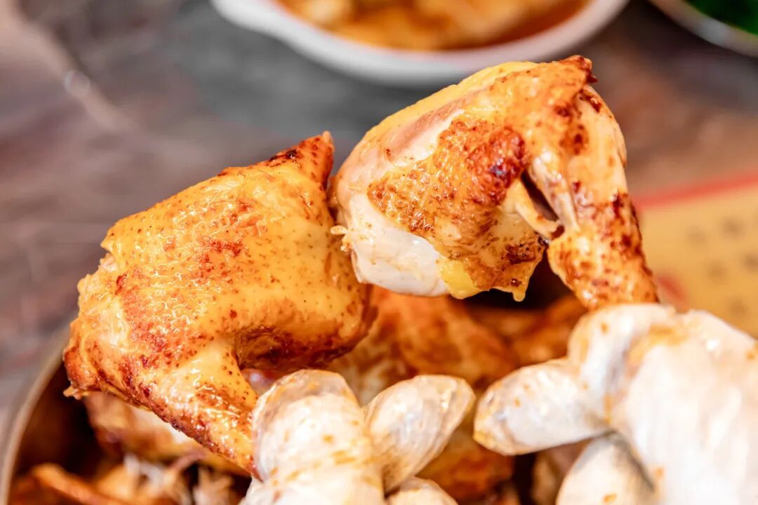 在博罗,吊炉烧鸡简直给食客们馋哭了!精选走地鸡用上特色吊烤,看金光灿烂的鸡皮就知道不一般。