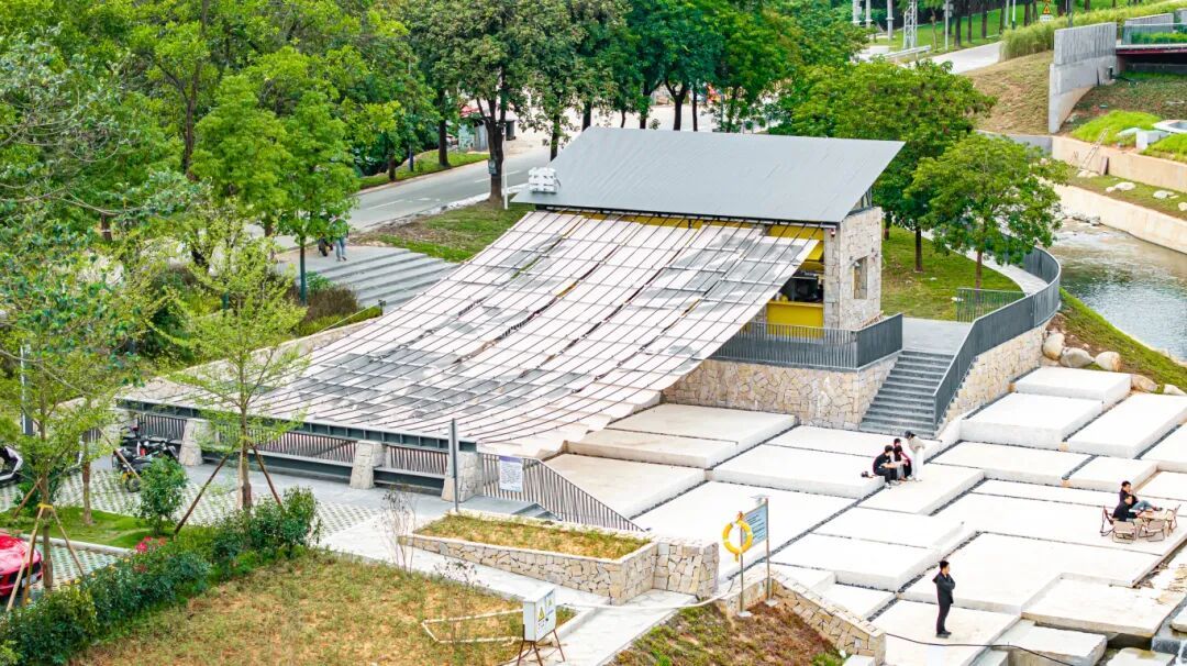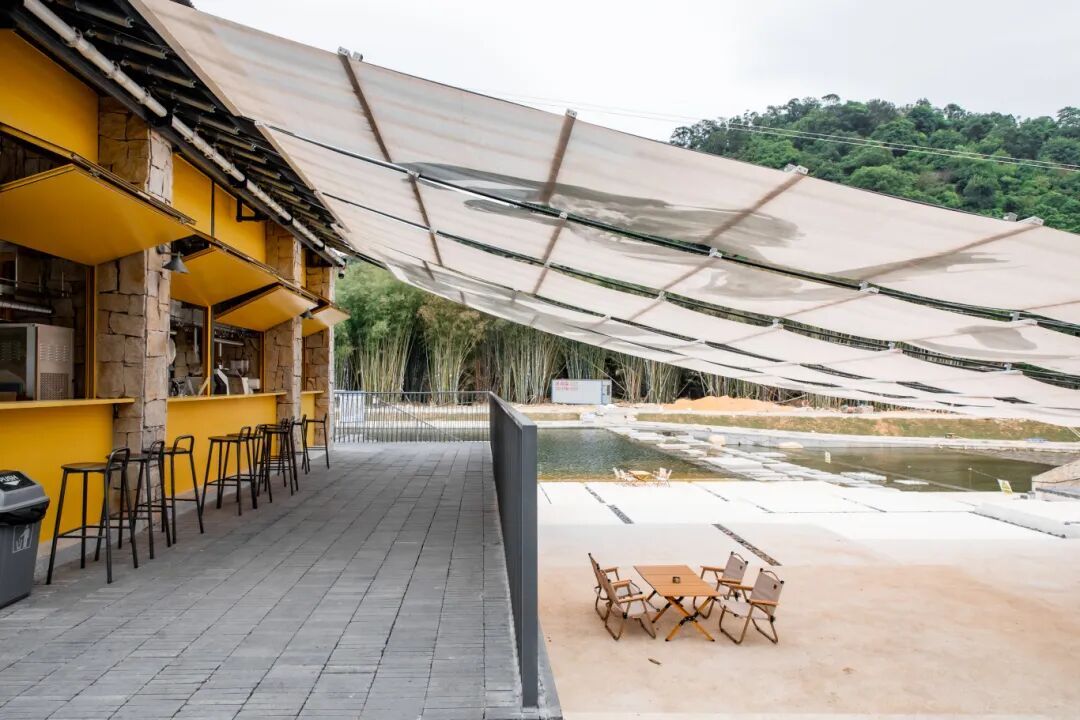 在驿站旁边便是下浪大幕艺术装置,游客们不仅可以在溪边戏水,体验一把古人夏日“临溪濯足”快乐,还可以亲身感受工业风空间配宠物乐园、户外影院与竹影装置的独特体验。