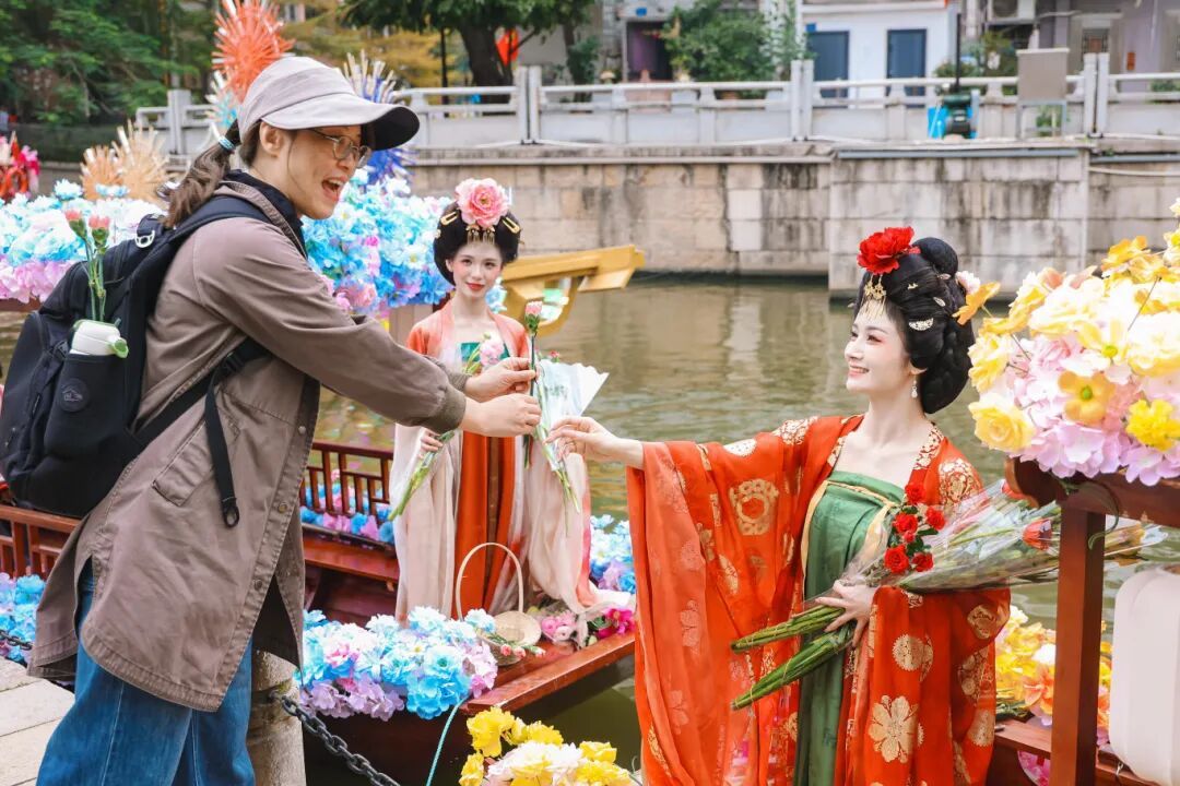 身着汉服、头戴簪花的“卖花姑娘”乘着花船,身背竹篓、肩挑花担的“卖货郎”游走在人群之间,旧时的花市叫卖声不绝于耳,一场穿越千年的国风盛宴,将水墨画中的古代花市带入2026年。