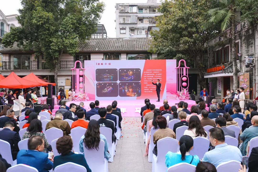 在水上花市开市仪式上,广州客轮公司进行了珠江游新春产品推介。荔湾文旅与广州客轮公司合作打造“长安灯影·水上芳华”主题花船,推出从白鹅潭艺术码头、西堤码头等五大主题码头出发的迎春花市航班,并在花市现场设置特色摊位,展销珠江游主题文创产品与优惠游船票务,致力推动“水上花市”从荔湾水系向珠江延展,形成具有广府特色的节庆IP矩阵。通过新春巡游、岸线互动等情景,形成水陆联动、步移景异的水上动线,让新春喜庆氛围从荔湾涌一直延伸至珠江之上。