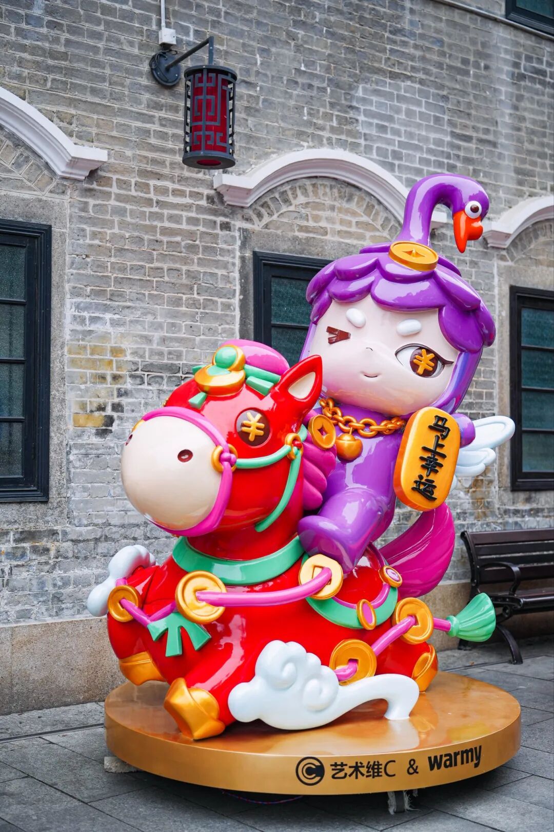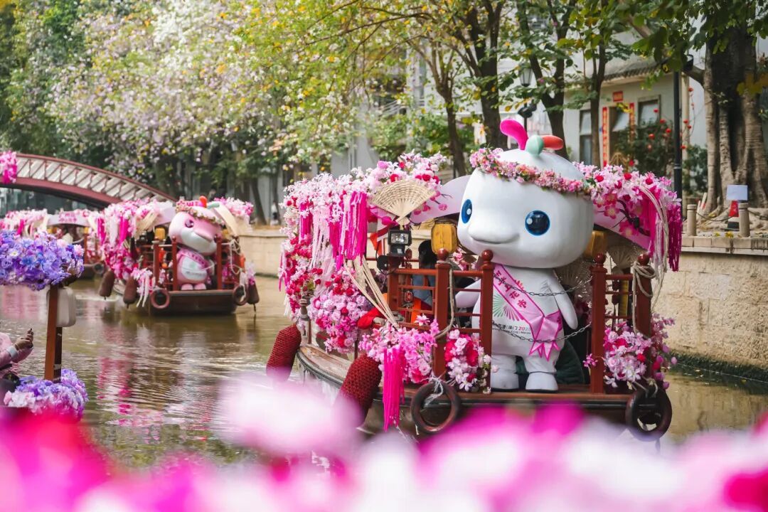 游客跟着“大湾鸡”的快乐脚步,逐个打卡沿街的艺术装置。铺满鲜花的粉嫩花船与“乐融融”融为一体,更有青年艺术家特别为马年设计的可爱玩偶装置,将时尚元素融入传统行花街活动,让人们转角便遇到潮玩之趣。