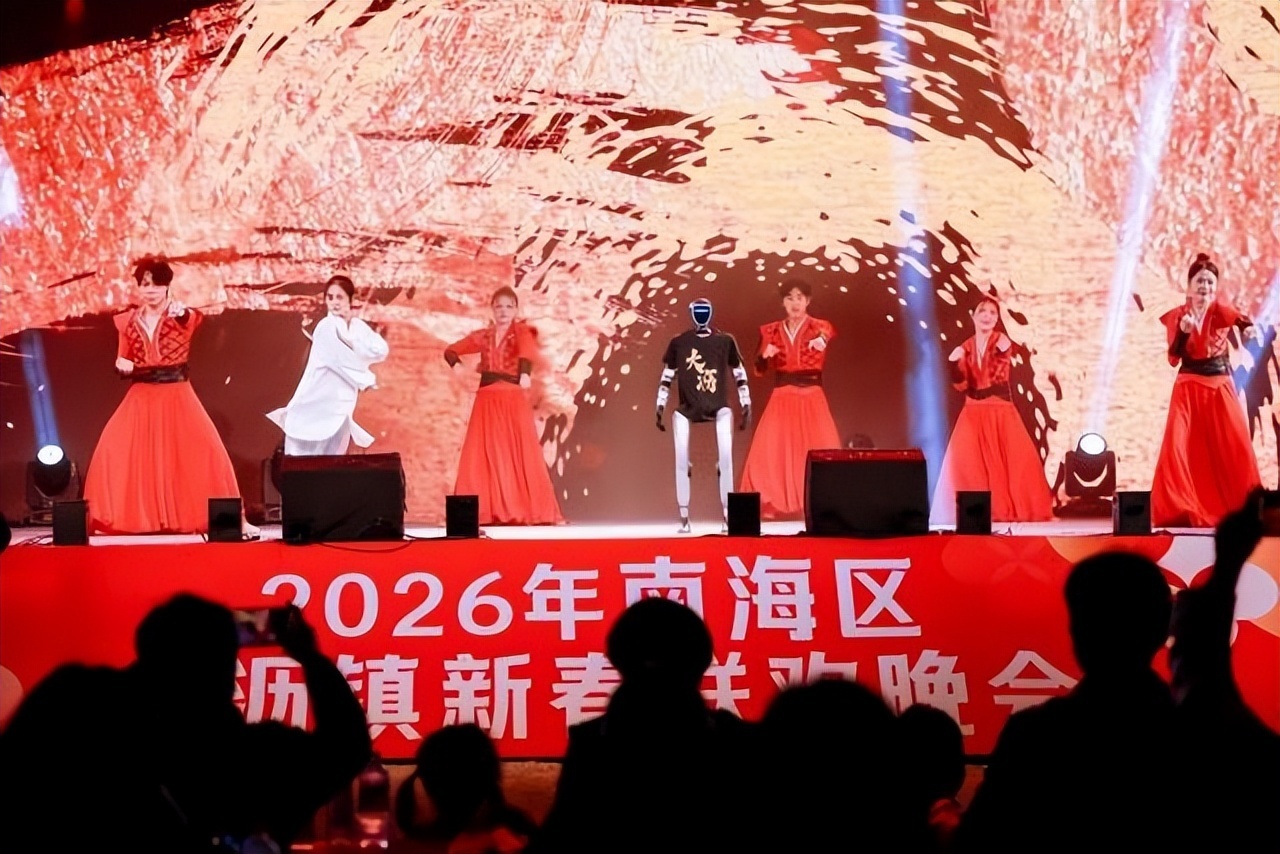 1月30日,佛山大沥“粤美村晚”紧跟时下潮流,将具身机器人融入节目中,机器人在舞台上大秀功夫。