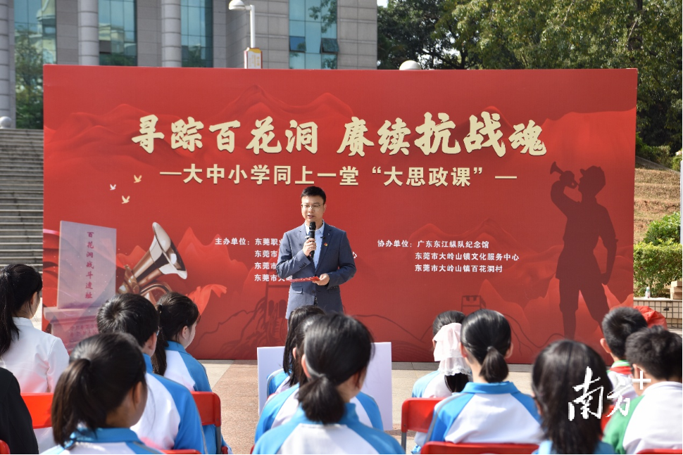 12月20日,大岭山百花洞村广场誓言铿锵、歌声嘹亮。来自东莞职业技术学院以及大岭山镇新风中学和中心小学的师生代表们,与广东东江纵队纪念馆、大岭山镇教育管理中心、文化服务中心、百花洞村一道,把思政课搬进百花洞战斗遗址,共同开启“寻踪百花洞,赓续抗战魂——大中小学同上一堂‘大思政课’”实践教学活动。