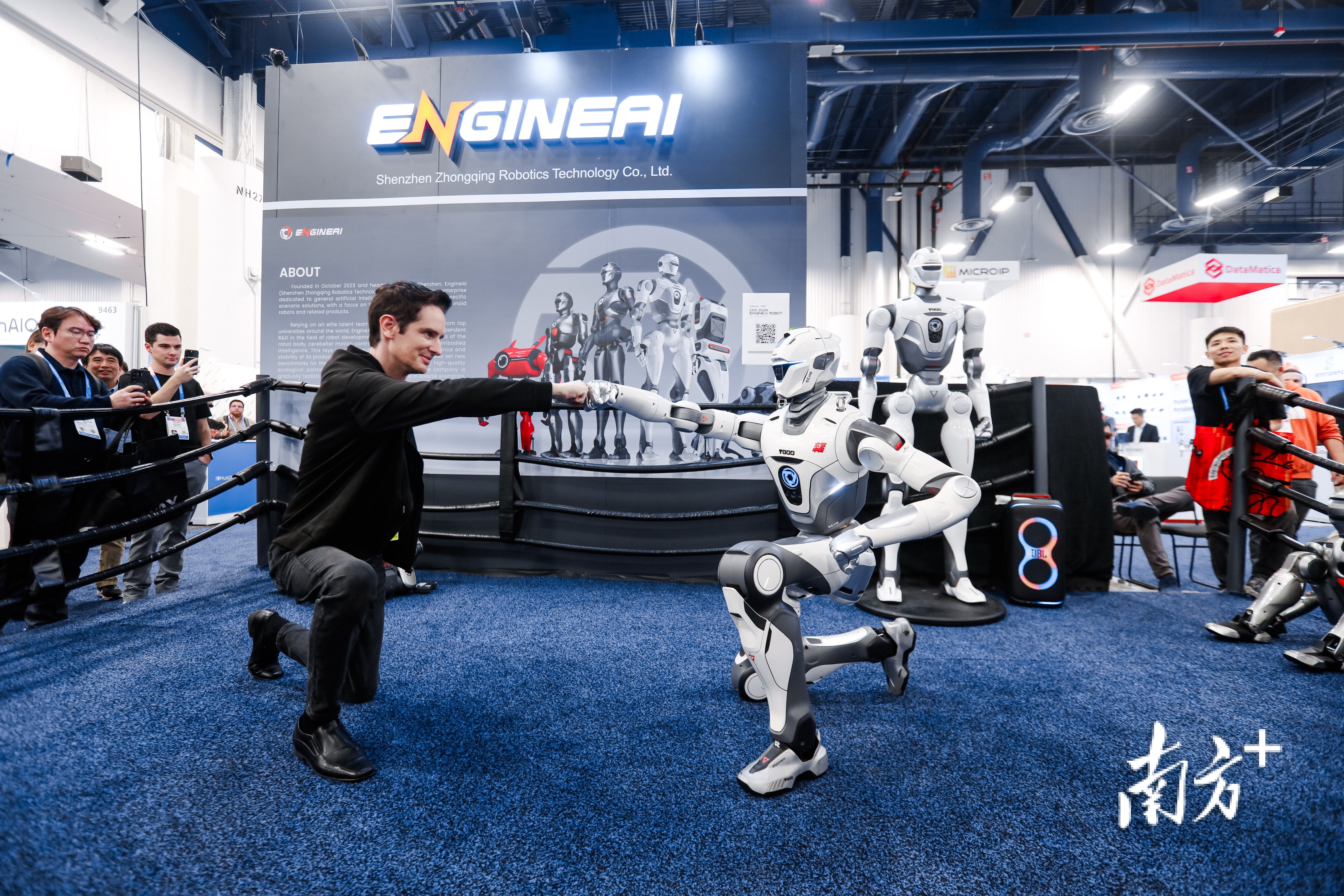 当地时间1月8日,2026国际消费类电子产品展(以下简称CES)正在美国拉斯维加斯如火如荼进行中。走进拉斯维加斯会展中心北馆会发现,开展仅几十分钟,深圳市众擎机器人科技有限公司(以下简称“众擎机器人”)展台前已经人气十足。机器人格斗、跳操、热舞,还和参展观众互动,赢得了阵阵赞叹。