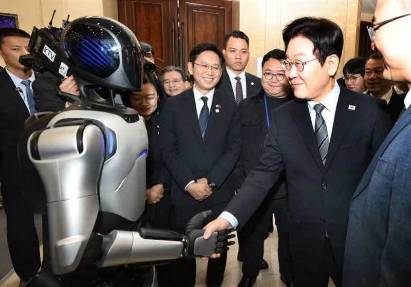 1月7日,中韩创新创业论坛在上海举行,韩国总统李在明与论坛企业展展区上的中国机器人握手。新华社发