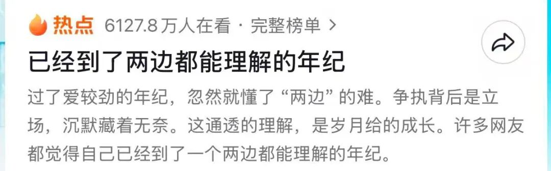 近日,话题“已经到了两边都能理解的年纪”,引发网友广泛讨论。