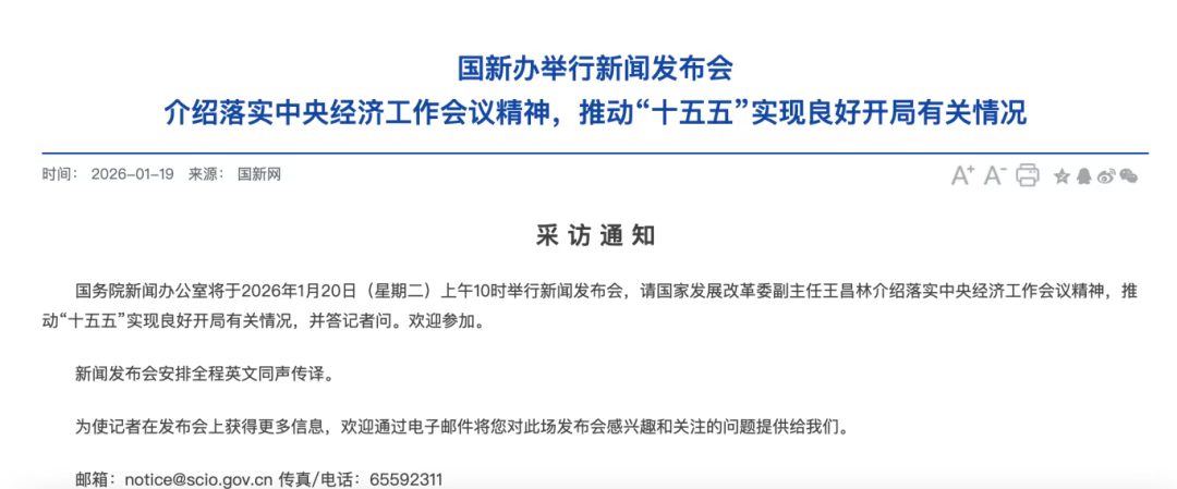 当天上午10时,国新办将举行新闻发布会,请国家发展改革委副主任王昌林介绍落实中央经济工作会议精神,推动“十五五”实现良好开局有关情况,并答记者问。直播预告>>