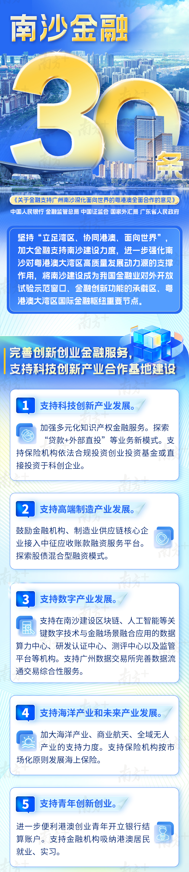 今天,中国人民银行、金融监管总局、中国证监会、国家外汇局、广东省人民政府联合发布《关于金融支持广州南沙深化面向世界的粤港澳全面合作的意见》(下称“南沙金融30条”)。