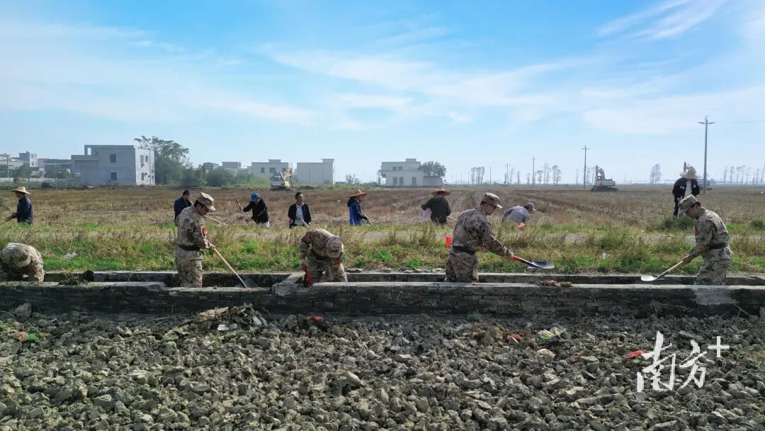 “南田村是‘粤西粮仓’雷州东西洋上的产粮大村,大家都盼着清淤后的沟渠,能引来更多的活水,滋养千亩良田。”村党支部书记郭高强说。民兵和村民背着铁锹、提着麻袋齐上阵,淤泥清出,塑料袋等杂物也被细心挑出来回收。