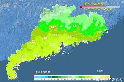 22日(初六),韶关、清远和肇庆市县多云间阴天,有小雨,其余市县多云间阴天,局部有零星小雨,大部市县早晚有(轻)雾。早晨最低气温:粤西和珠江三角洲中南部市县17~20℃,其余大部市县13~16℃。