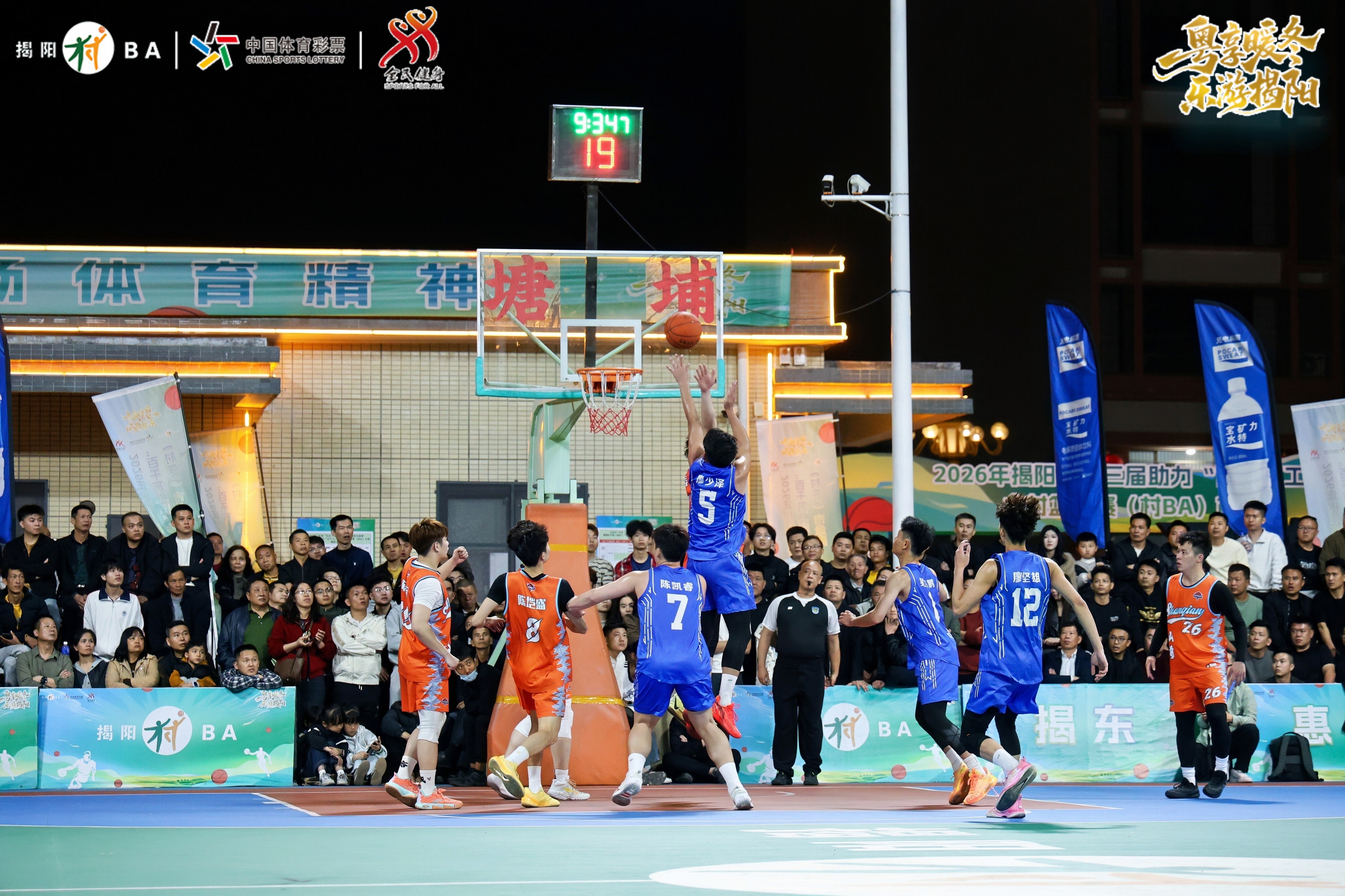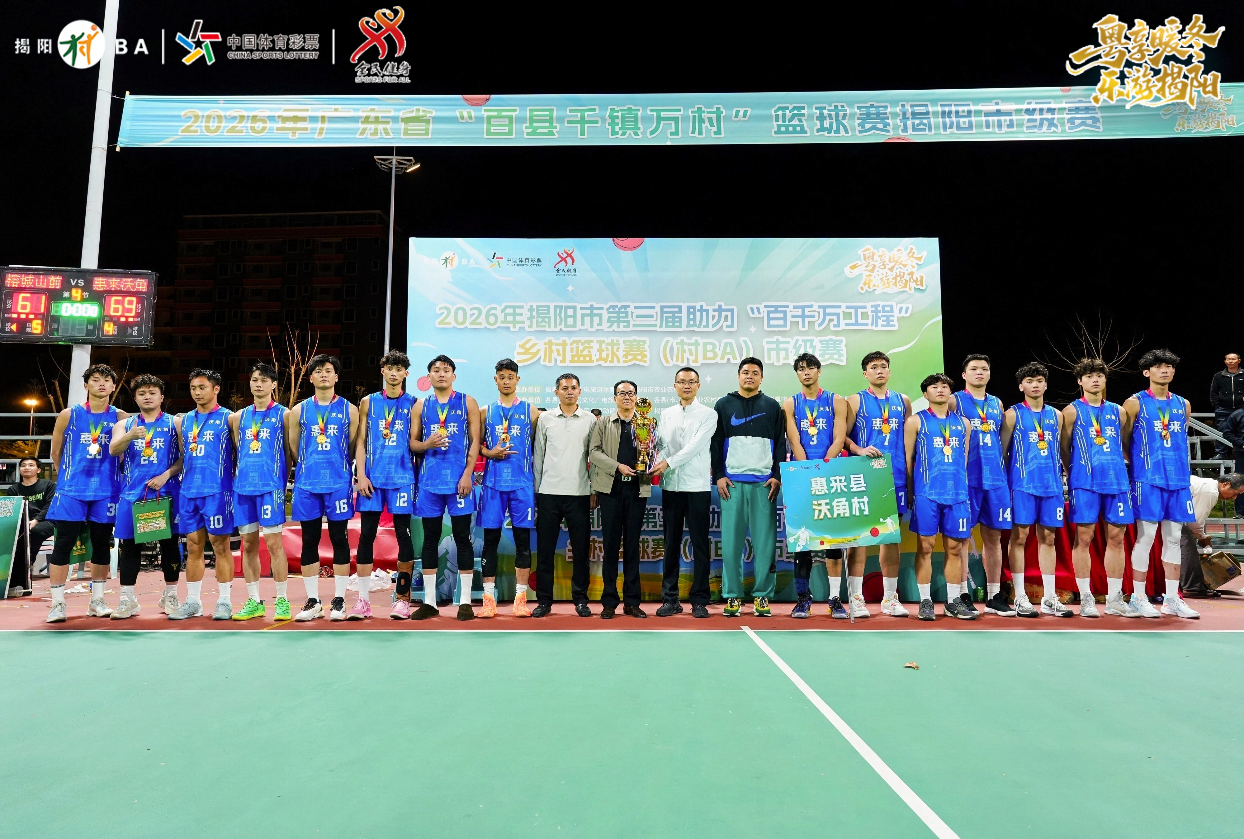 3月19日晚,揭阳市榕城区凤美街道塘埔村体育广场灯火璀璨、掌声雷动,2026年广东省“百县千镇万村”篮球赛揭阳市级赛暨揭阳市第三届助力“百县千镇万村高质量发展工程”乡村篮球赛(村BA)市级赛圆满落下帷幕,惠来县神泉镇沃角村代表队凭借出色发挥力压群雄,成功摘得本届赛事冠军。当晚,线上线下5万多人次观众观看,赛场内外人声鼎沸,成为揭阳老百姓家门口极具烟火气的“体育狂欢盛宴”。