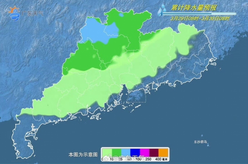 具体预报为,29日至31日,受南支槽和弱冷空气共同影响,粤北和珠江三角洲中北部市县先后有一次大雨局部暴雨或大暴雨,其余市县有雷阵雨局部大雨,雷雨时伴有8至10级短时大风、部分市县有冰雹,大部市县早晚有轻雾或雾。白天最高气温为,清远、韶关和肇庆北部市县24℃至27℃,雷州半岛市县30℃至33℃;其余大部市县27℃至30℃。