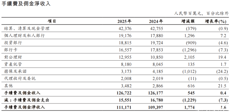 非利息收入方面,2025年该行实现非利息收入1662.69亿元,同比增长11.8%,占营业收入20.7%。其中,手续费及佣金净收入1111.71亿元,同比增长1.6%,结束了此前连续3年下跌趋势;其他非利息收益550.98亿元,增加157.74亿元,增长40.1%。