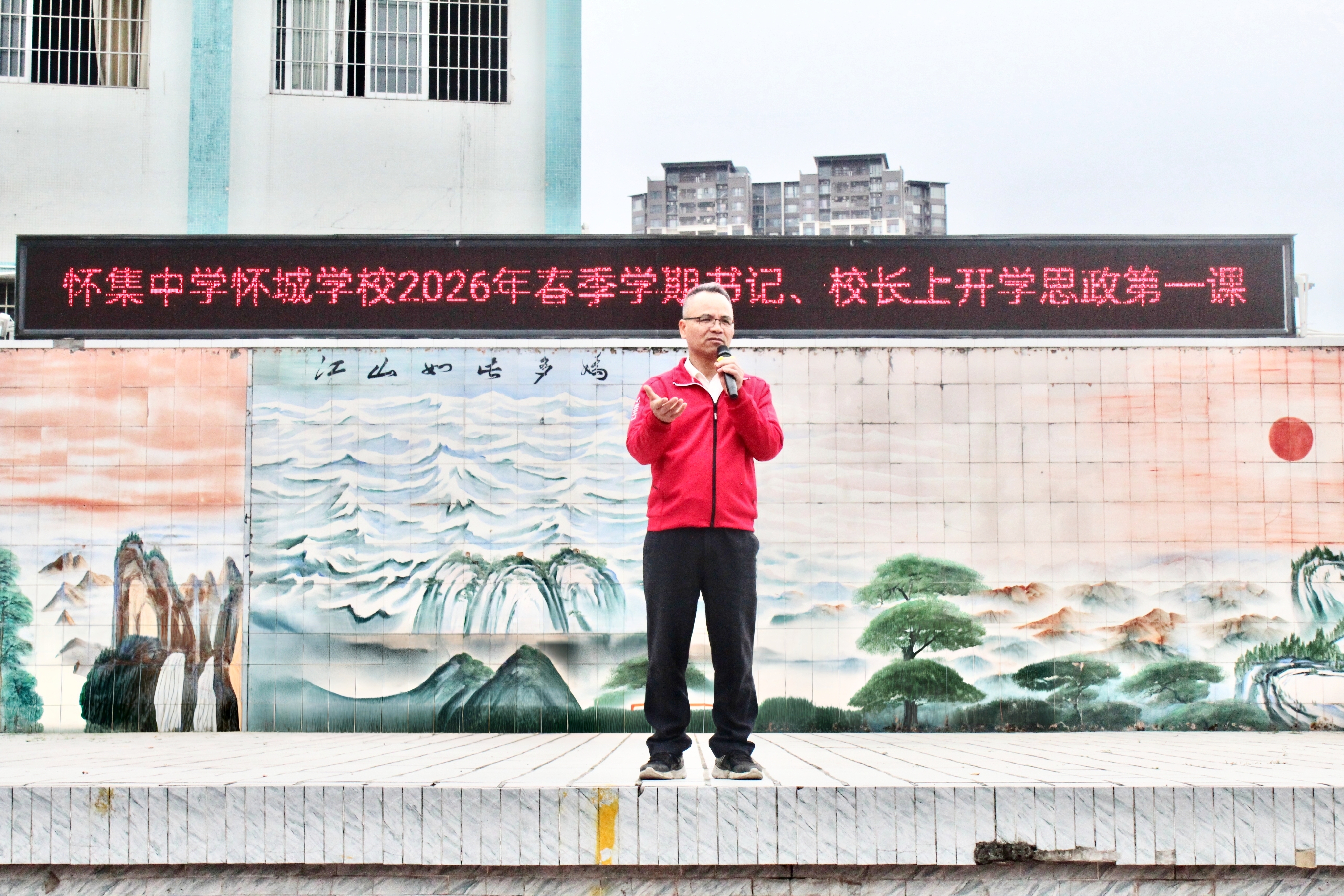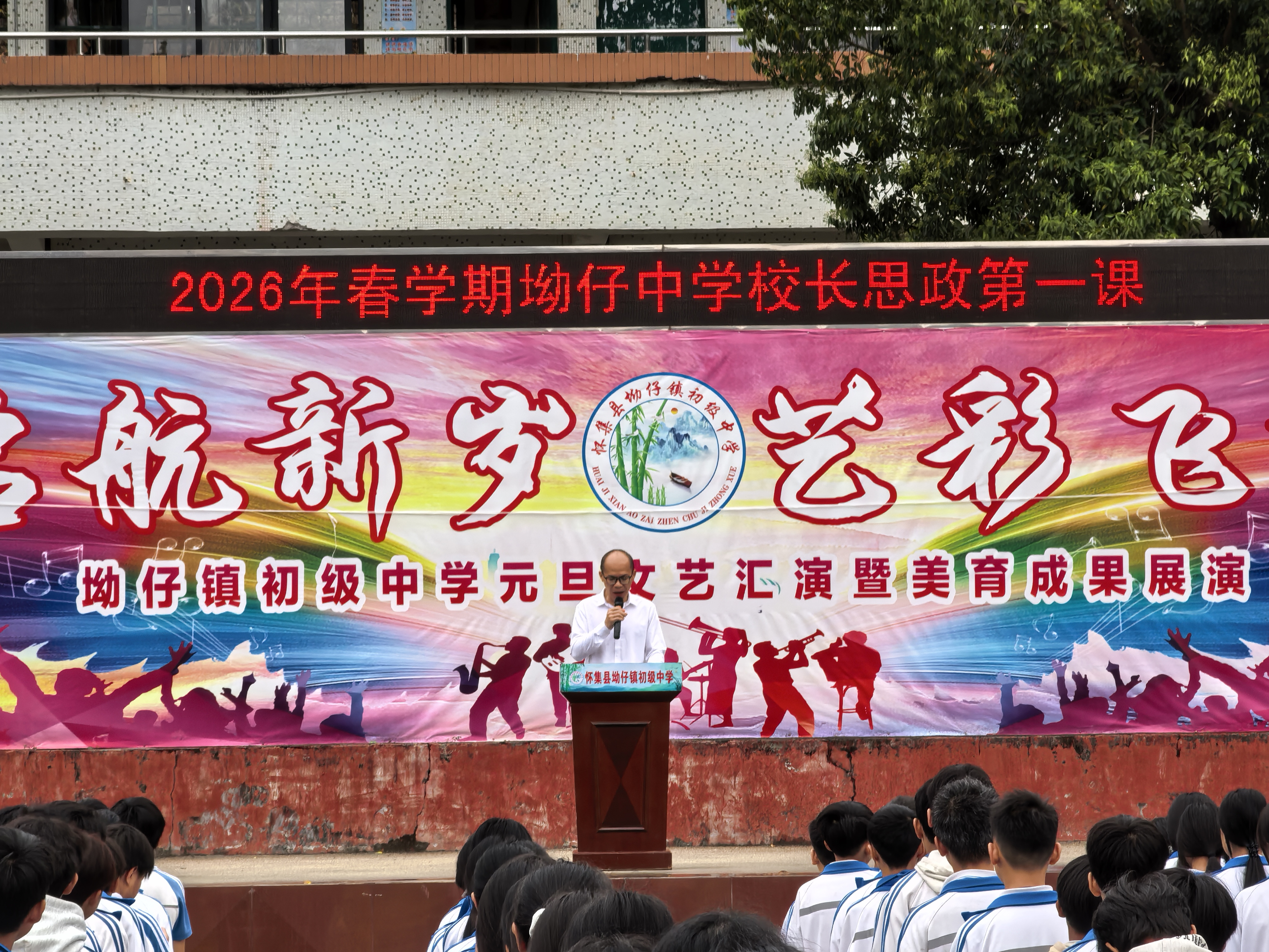 怀集中学校长李波明以“骏马春风驰正道,万象更新育栋梁”为题,为全校师生讲授了2026年春季学期思政第一课。李波明结合建校15周年实际,勉励师生:一是以龙马精神启新程,践行“健康第一”理念,以勇夺全国攀岩冠军和市女足冠军的同学们为榜样,做身心健康的阳光少年;二是以策马之态勤学善思,做笃行担当的怀中人,面对人工智能浪潮,以终身学习应对变革,以书香校园涵养心灵,以科技竞赛锤炼能力,用笃行担当续写佳绩;三是以骏马正道明方向,做有根有魂的栋梁,牢记“怀德炀和,中正慧美”校训,以建校十五周年为契机传承怀中精神,心怀家国、行有方向,成为可堪大用的时代新人。