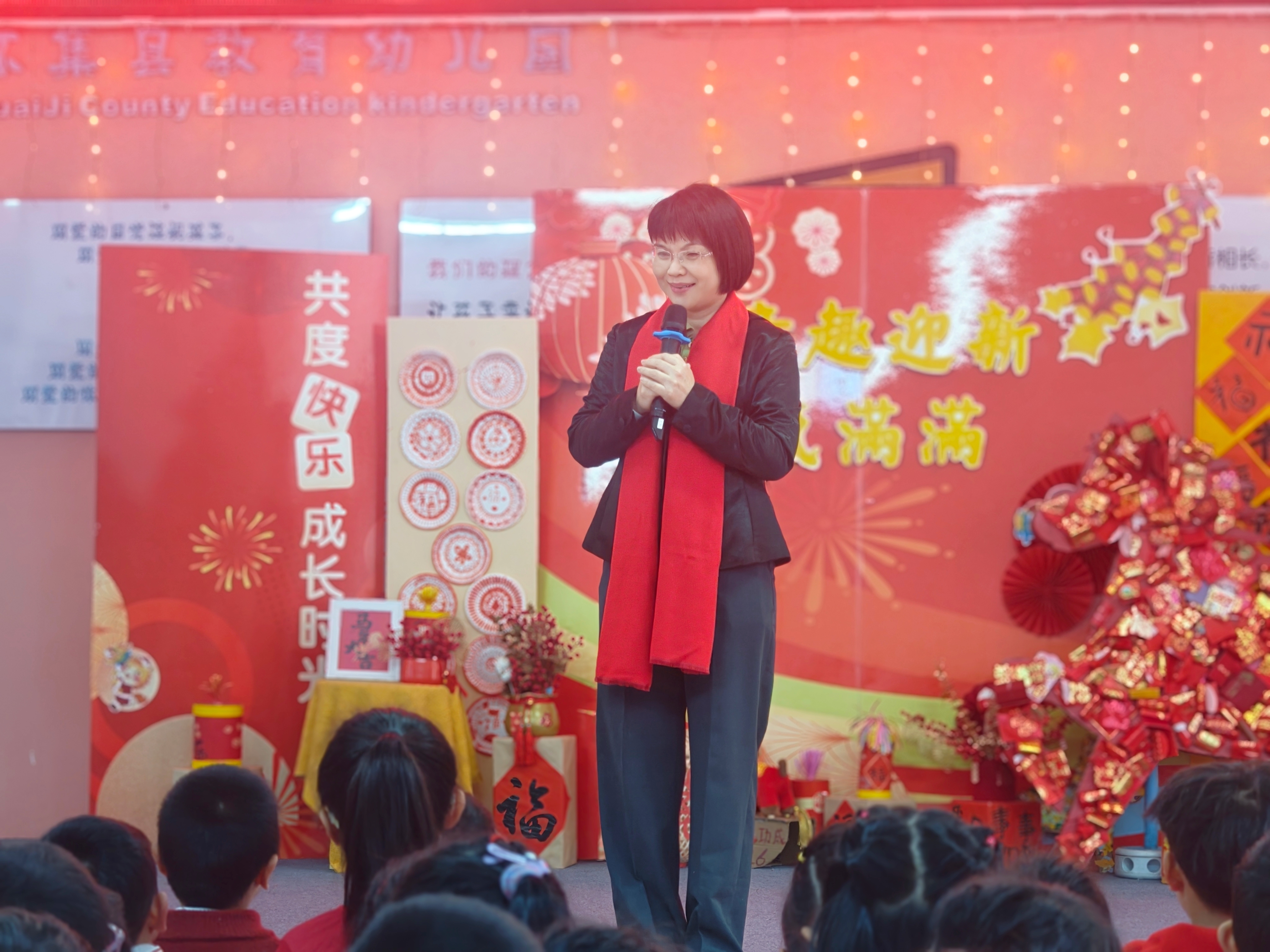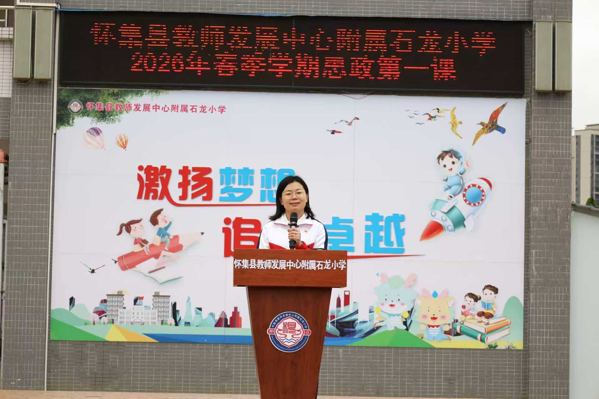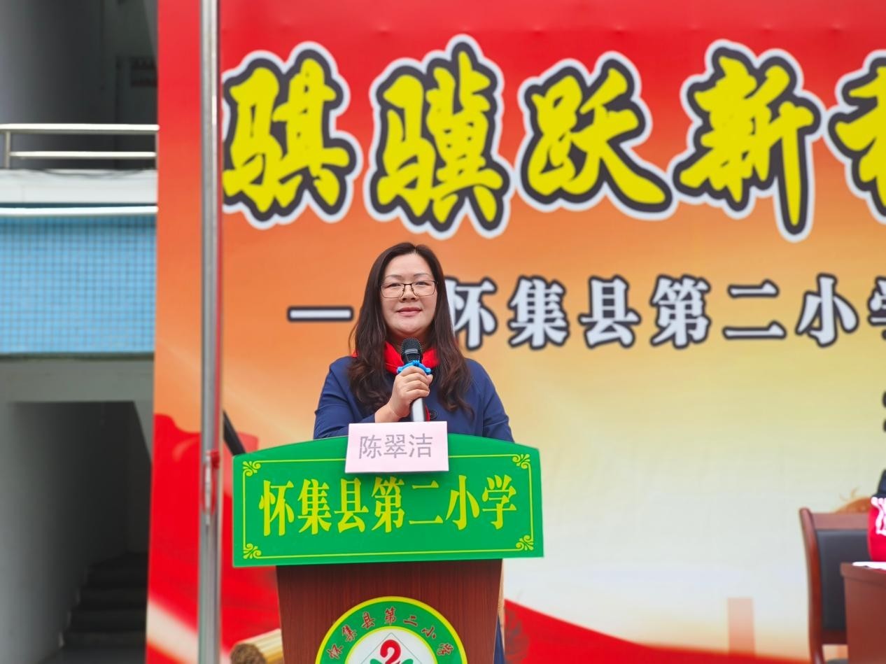 怀集县教师发展中心附属石龙小学党支部书记、校长梁夕云以《花神骏马跃新程,科技少年创未来》为题,向全体师生送上三个“新年礼物”:“团团圆圆”里的花,寓意各美其美、团结绽放;“前程万里”的马,勉励师生如骏马奔跑、永不停步;“热情替代炮仗”里的光,鼓励孩子们爱思考爱创造。