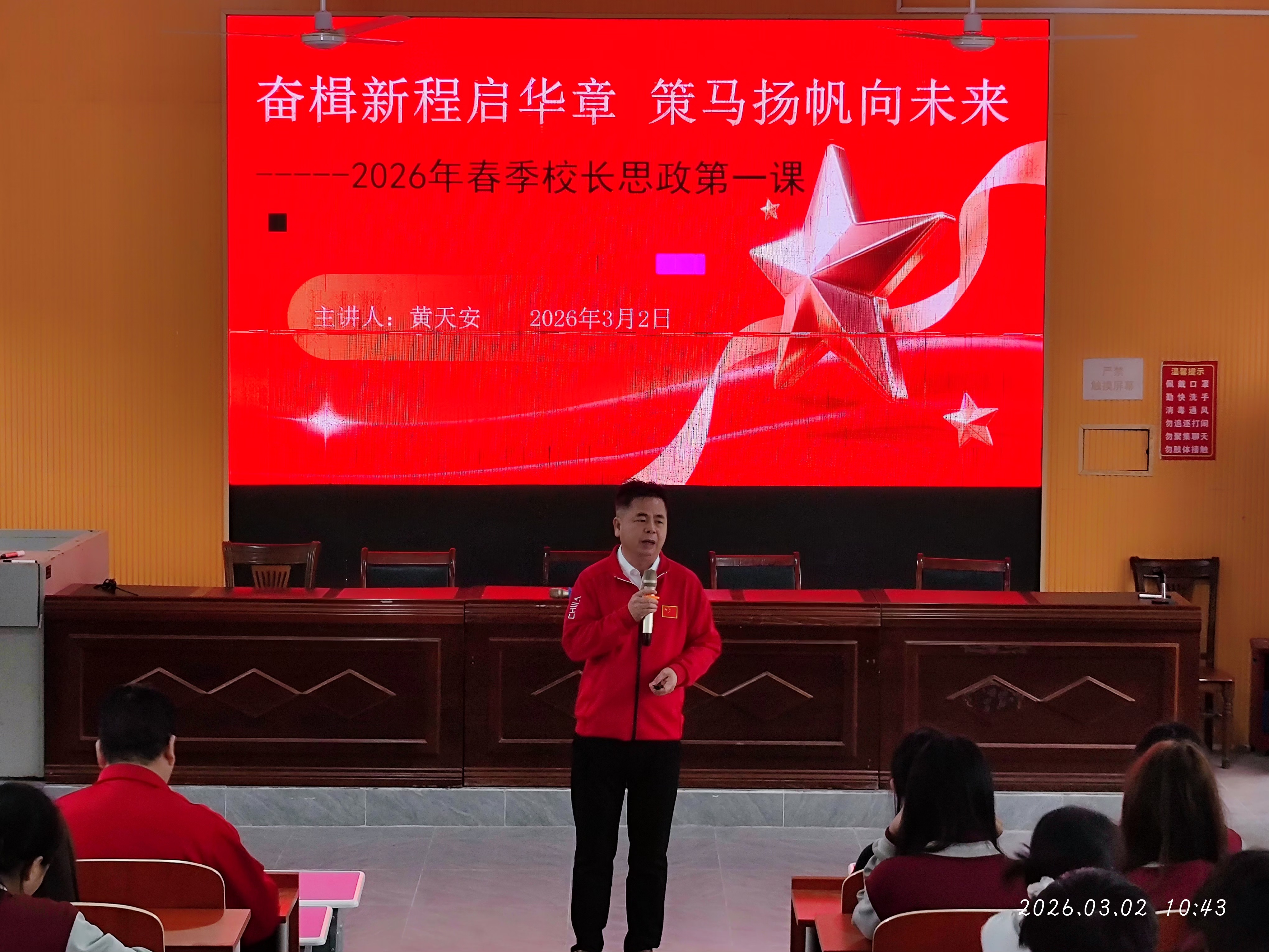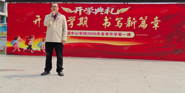2026年春季开学季,甘洒镇中心学校书记、校长黄天安以“奋楫新程启华章,策马扬帆向未来”为主题讲授思政第一课,期望学子以马之奋进、坚韧为志,心怀家国立理想,勤学善思勇奋斗,文明有礼修品德,牢记安全会自护。