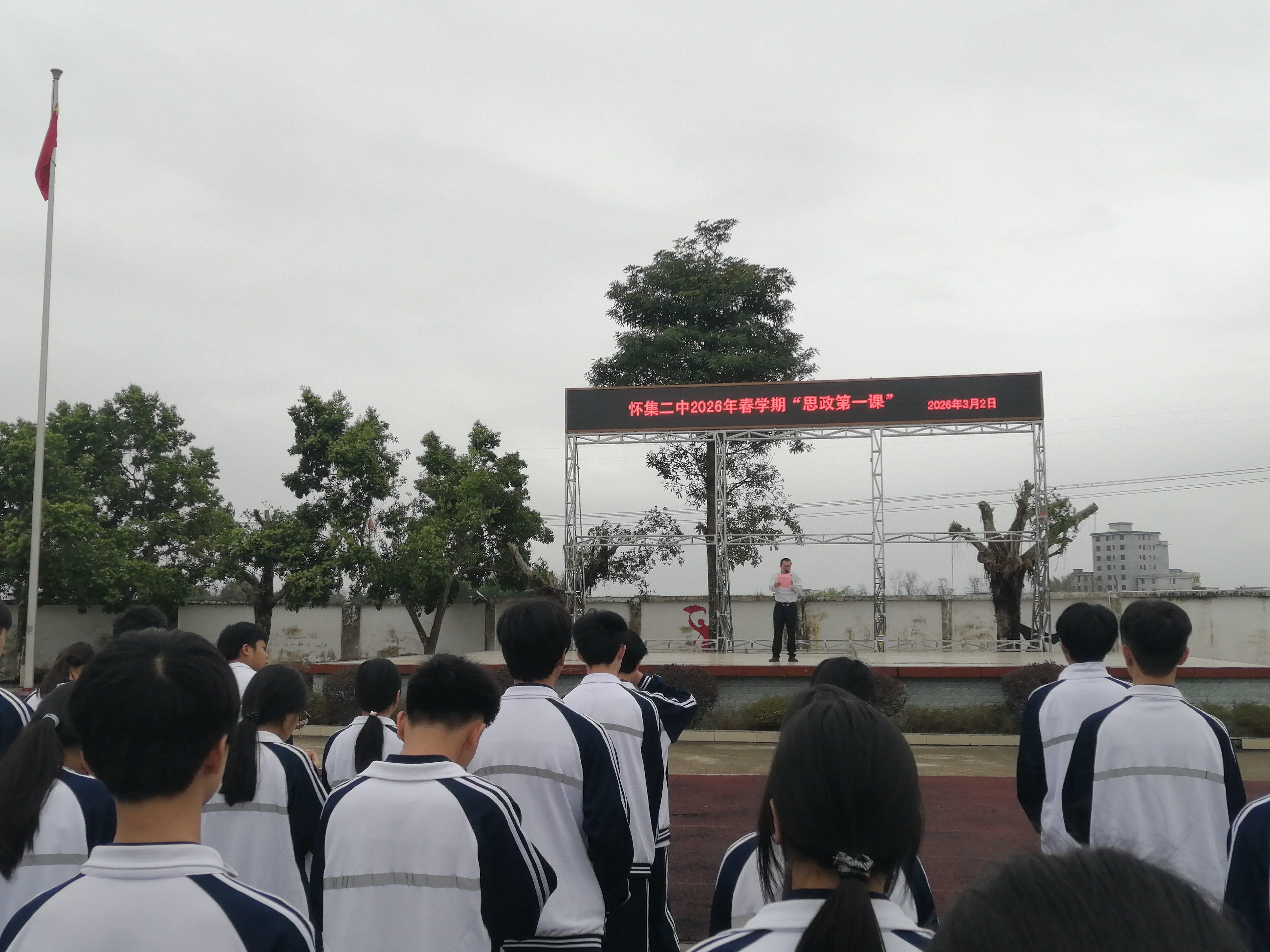 怀集中学怀城学校党支部书记、校长聂廷庆在思政第一课寄语全体同学,要坚定理想信念,厚植家国情怀,把个人成长与国家发展紧密相连,努力成长为有理想、敢担当、能吃苦、肯奋斗的新时代好青年;希望全体教师坚守为党育人、为国育才初心使命,立德树人、潜心教学,以高尚师德引领学生,以扎实学识培育学生。