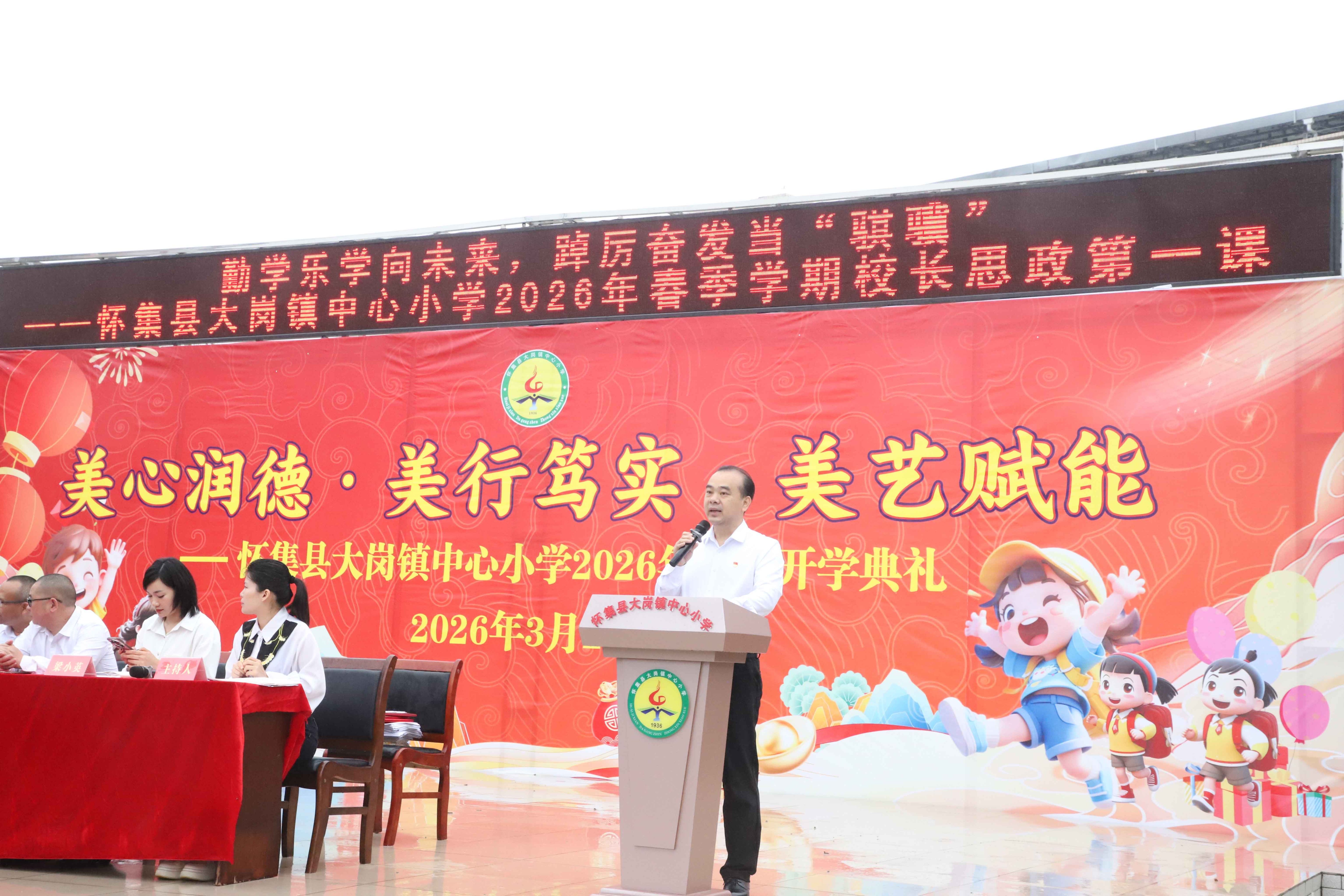 以“美心润德·美行笃实·美艺赋能”为主题,大岗镇中心小学党支部书记、校长韦知发向学生讲授思政第一课。他指出,“美心润德”重在涵养美好心灵,从日常善举做起,培育感恩、正义与坚韧之德,做美德践行者、榜样传递者和家国小卫士;“美行笃实”强调知行合一,通过设定小目标、锤炼工匠精神、突破舒适区,以踏实行动铸就成长阶梯;“美艺赋能”依托非遗进校园、学科美育融合等载体,让艺术与智慧点亮生命,赋能全面发展。