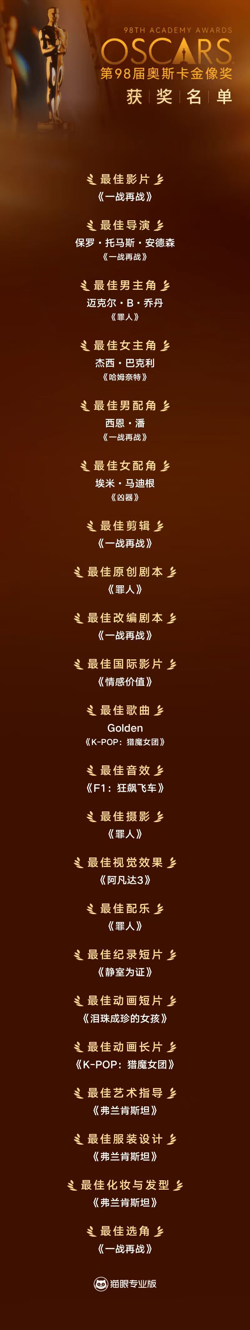 第98届奥斯卡金像奖完整获奖名单如下: