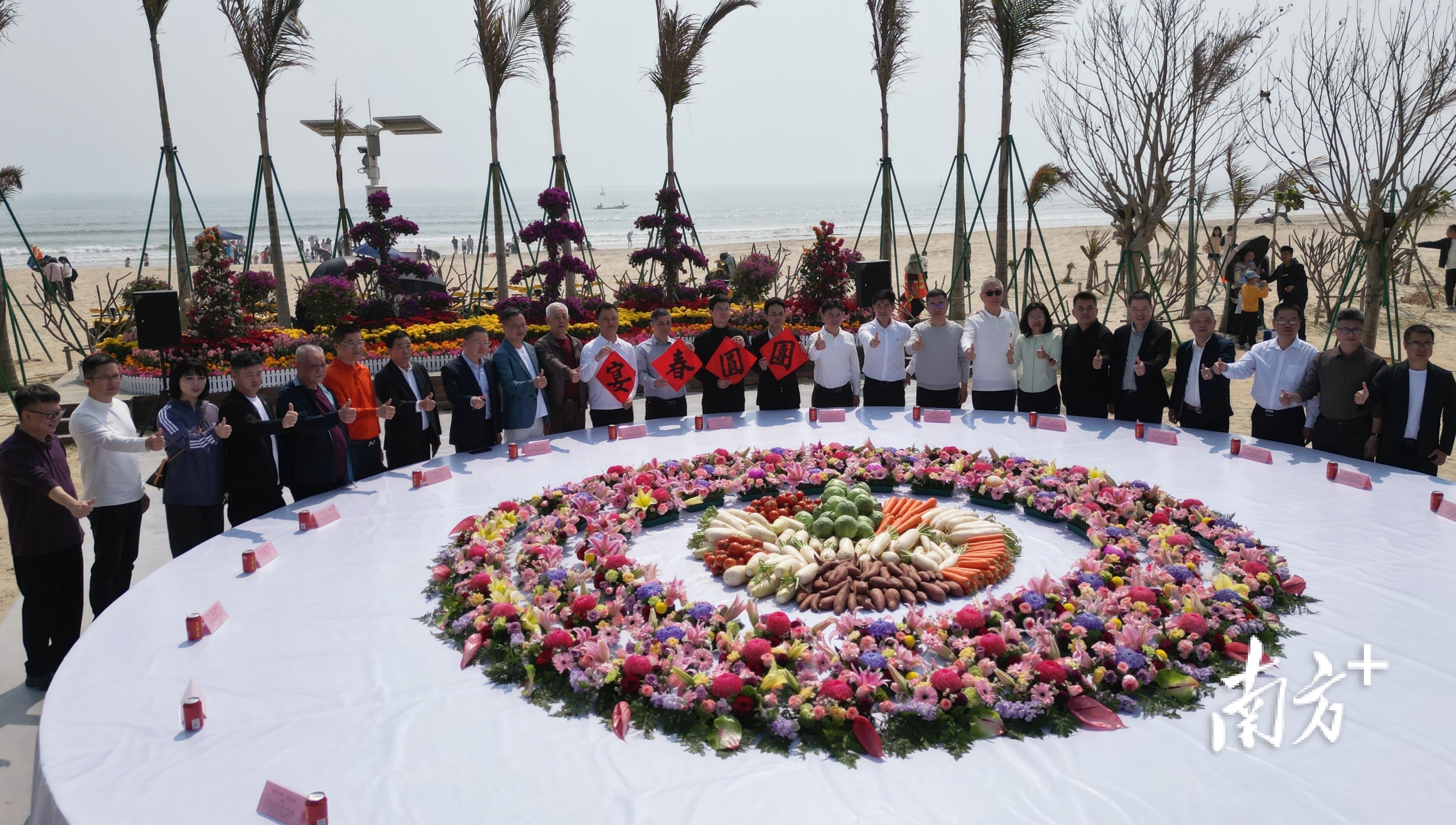 回到甜心湾广场,一顿别具潮汕特色的“团圆春宴”已准备就绪。宴席菜品以井都菜脯、鲜采番薯、廷顺咸菜等本土农创食材烹制佳肴,特别融入正月初七“七样羹”民俗,搭配红桃粿等传统粿品,让游客充分品味本土味道,体验特色民俗。