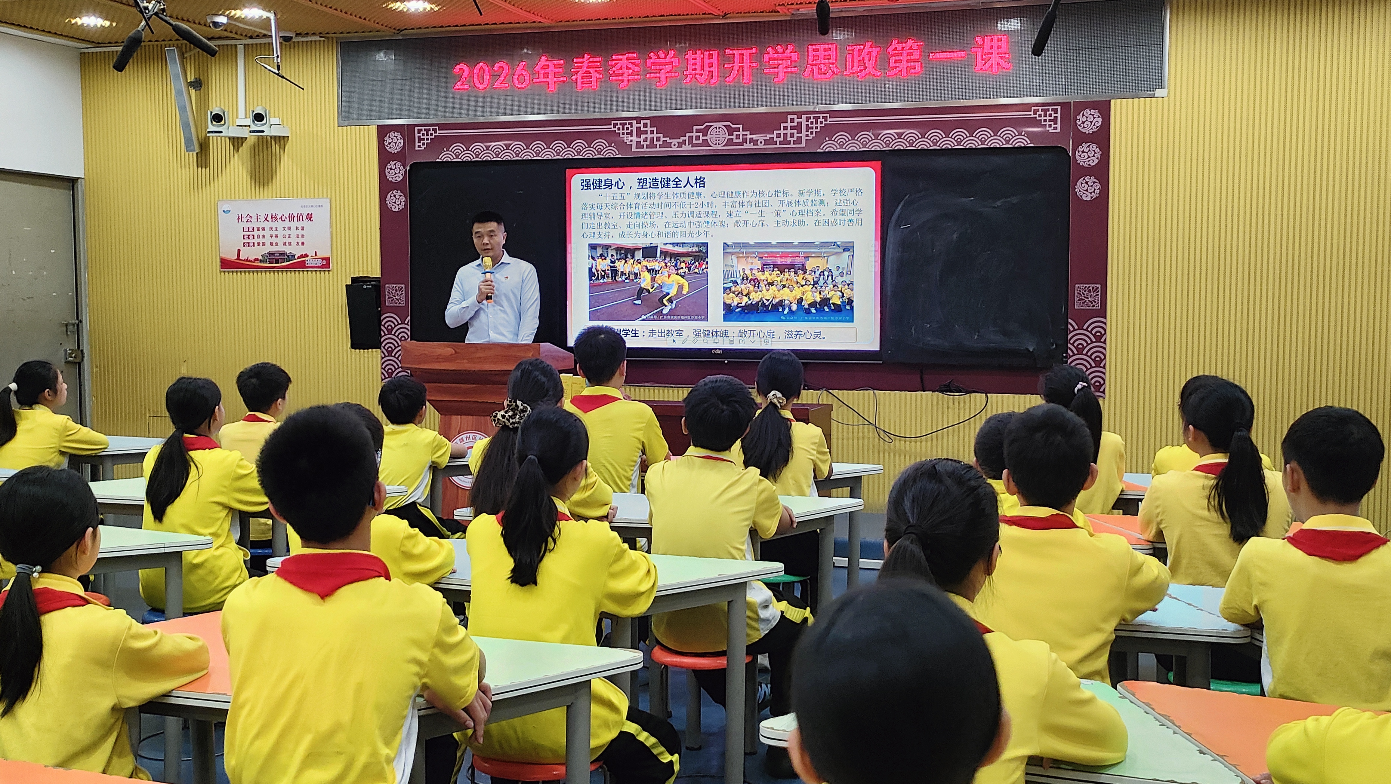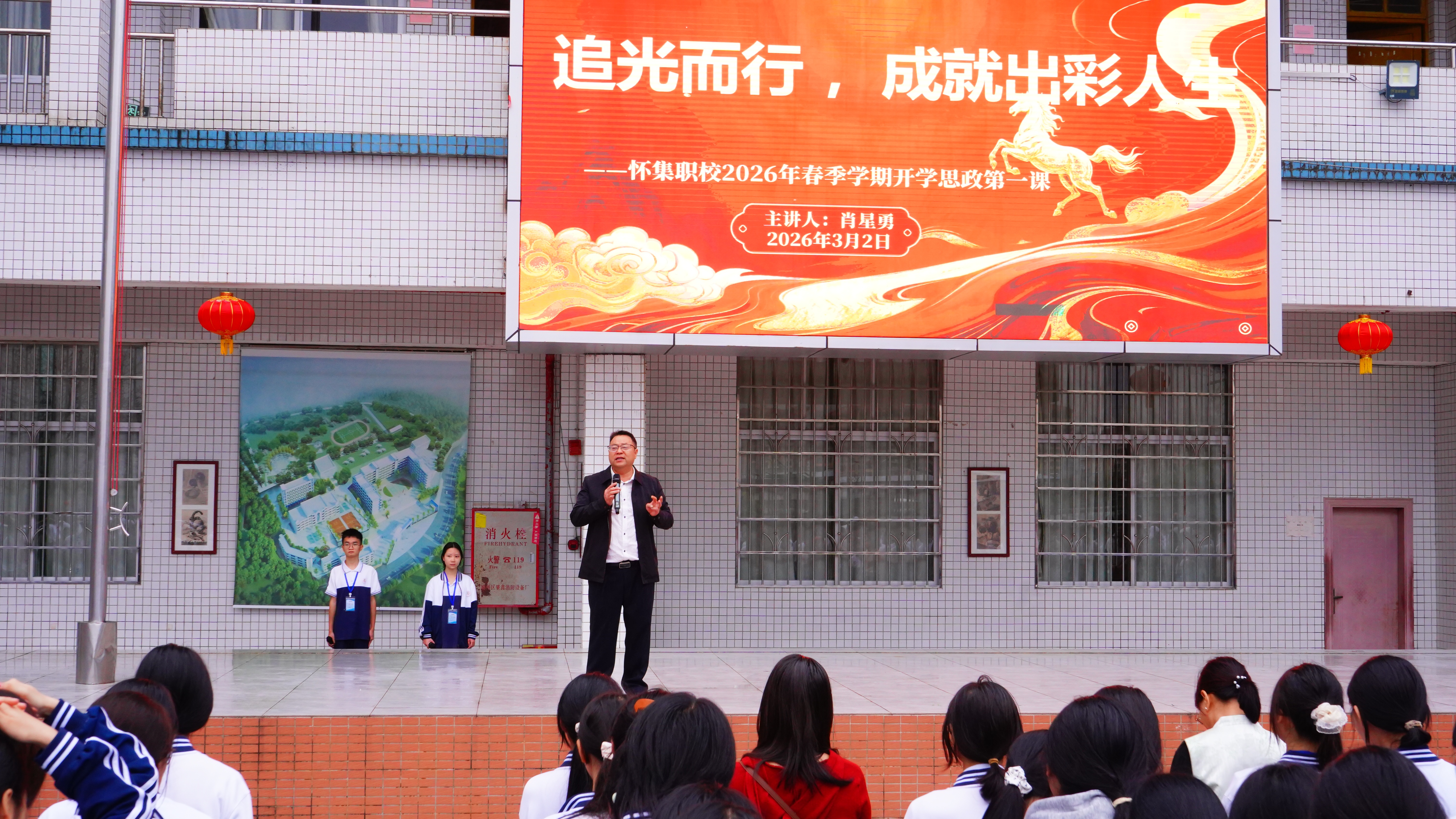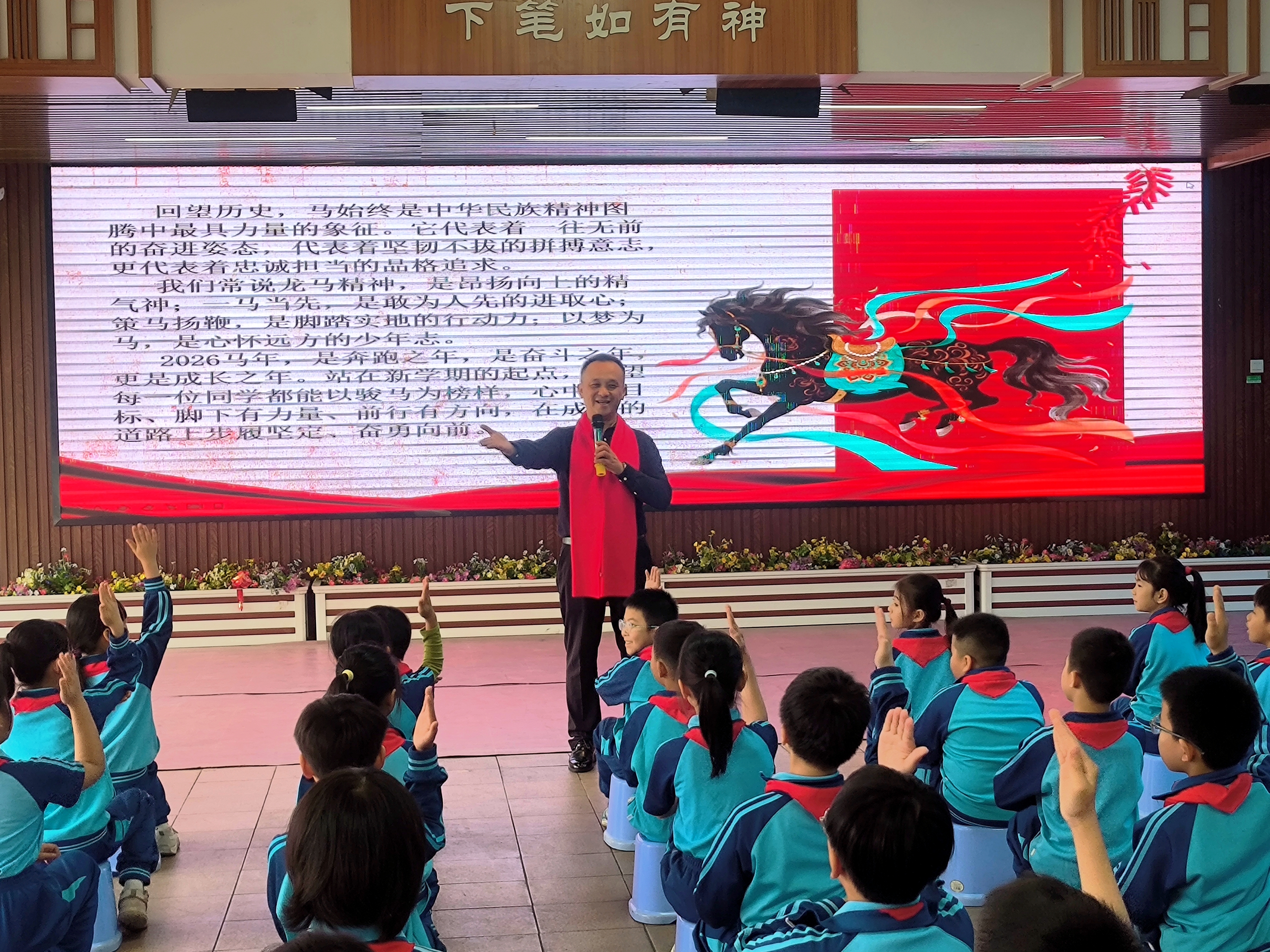 他以“骏马启新程,争做追‘锋’好少年”为题开展校长思政第一课。他指出,马是中华民族精神中最具力量的象征,代表一往无前的奋进姿态、坚韧不拔的拼搏意志、忠诚担当的品格追求。勉励全体师生涵养龙马精神,昂扬向上、一马当先、敢为人先、策马扬鞭、脚踏实地、以梦为马、心怀远方。