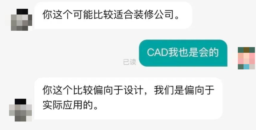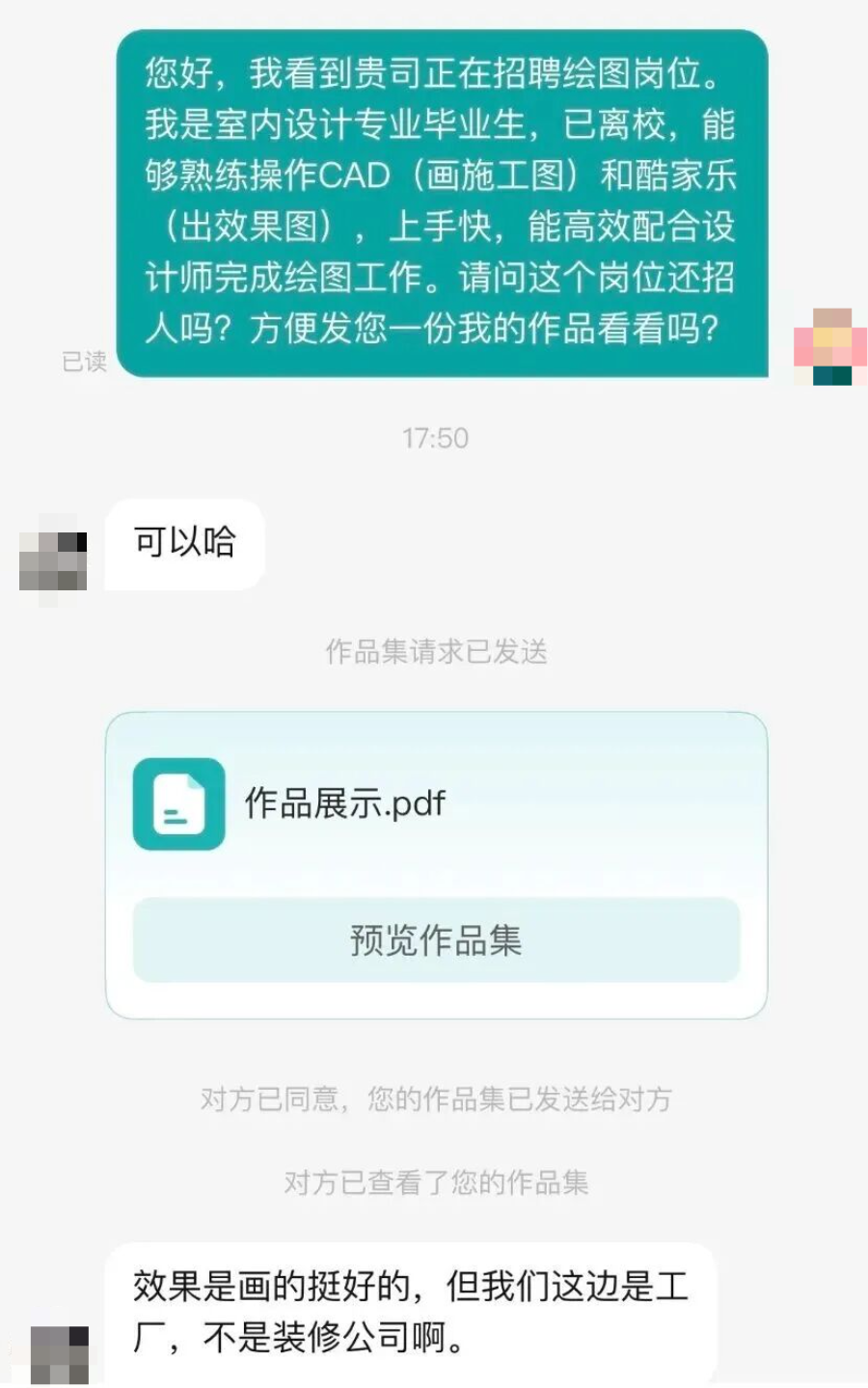 回复张女士的HR来自广东佛山南海区一家金属制品企业。张女士说,这位HR看到她的作品集后表示,画得很好,但是偏向设计,更适合装修公司,“我们是工厂,偏向实际应用”。