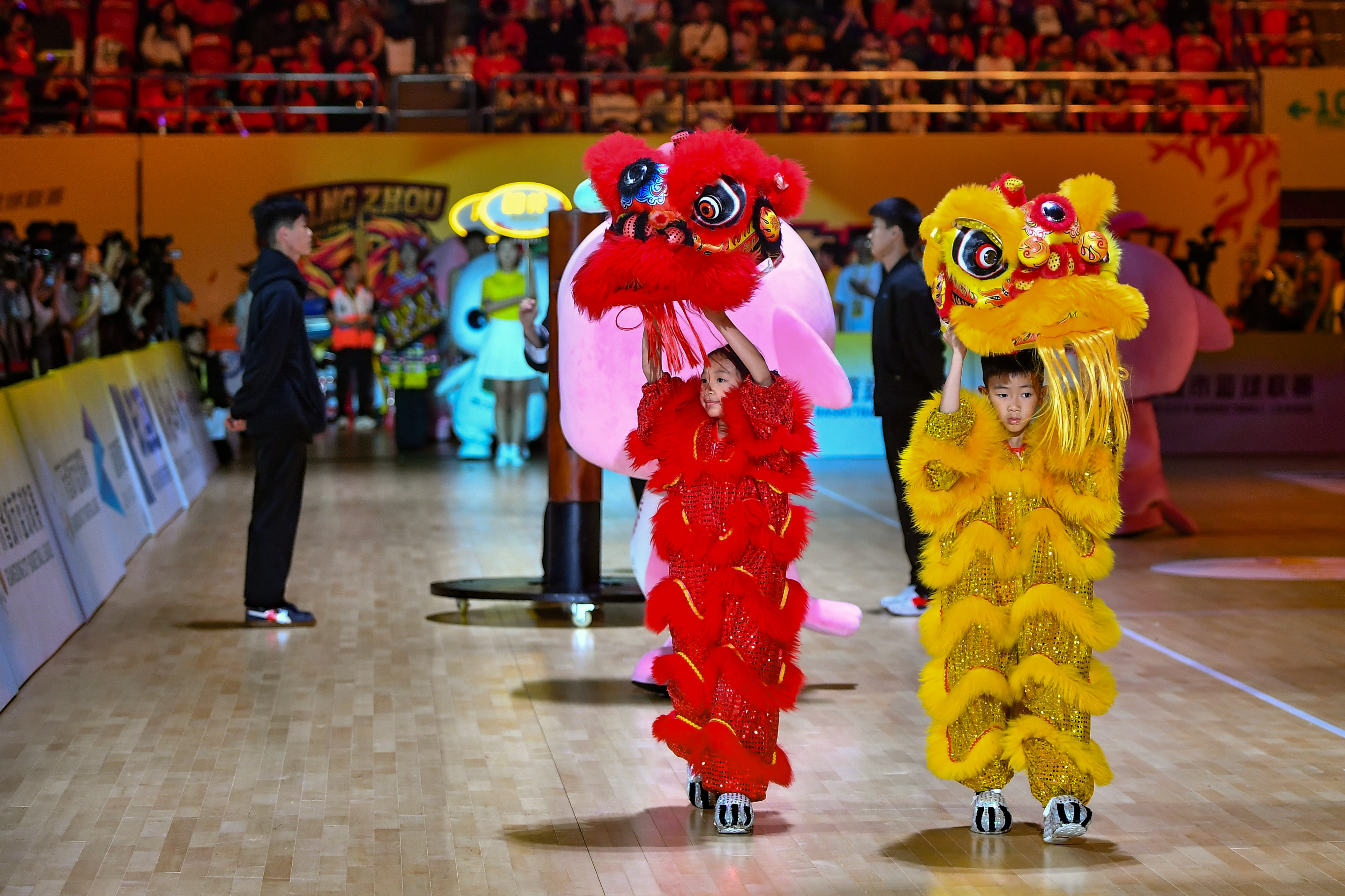 作为开幕式第一篇章的演出,桥头醒狮团甫一登场便点燃全场。数只色彩斑斓、威风凛凛的醒狮在场上辗转腾挪,时而昂首阔步尽显王者之风,时而俏皮嬉戏与观众亲密互动。高难度的腾挪跳跃技巧接连上演,不仅展现了桥头醒狮扎实的功底,更寓意着篮球健儿们在赛场上“步步登高”的拼搏精神。