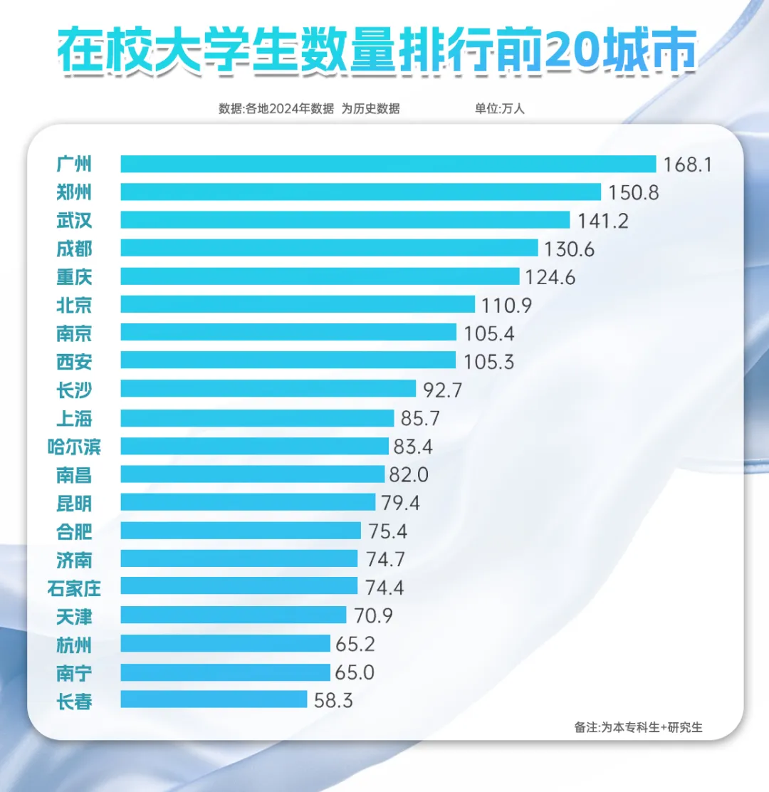 算下来,在广州几乎每10个人中就有1个在校大学生,人才密度之高可见一斑。