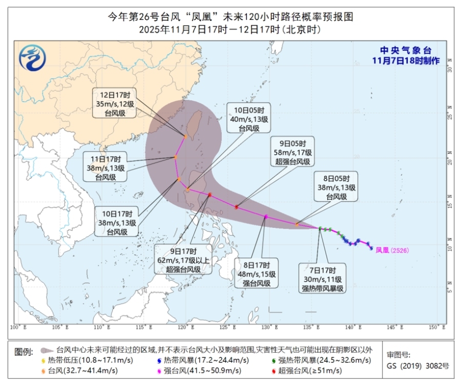 省气象台预计,“凤凰”将向西偏北方向移动,强度逐渐加强,最强可达超强台风级(16—17级),它将在9日登陆菲律宾吕宋岛北部后强度有所减弱,随后在10日移入南海东部海面,之后转向偏北方向移动,趋向台湾海峡南部海面。