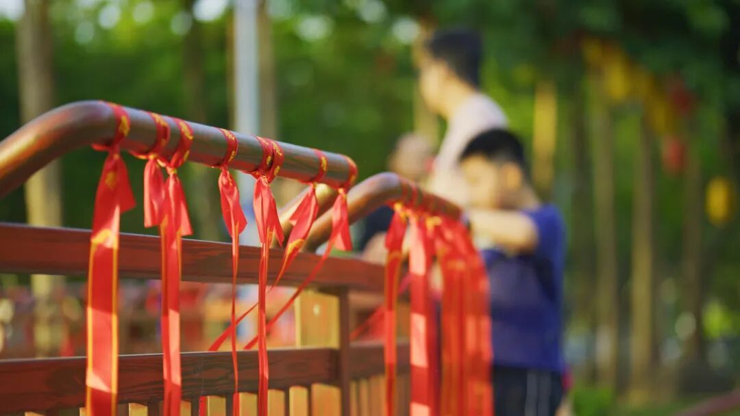 系满祝福的红飘带在微风中轻轻摇曳