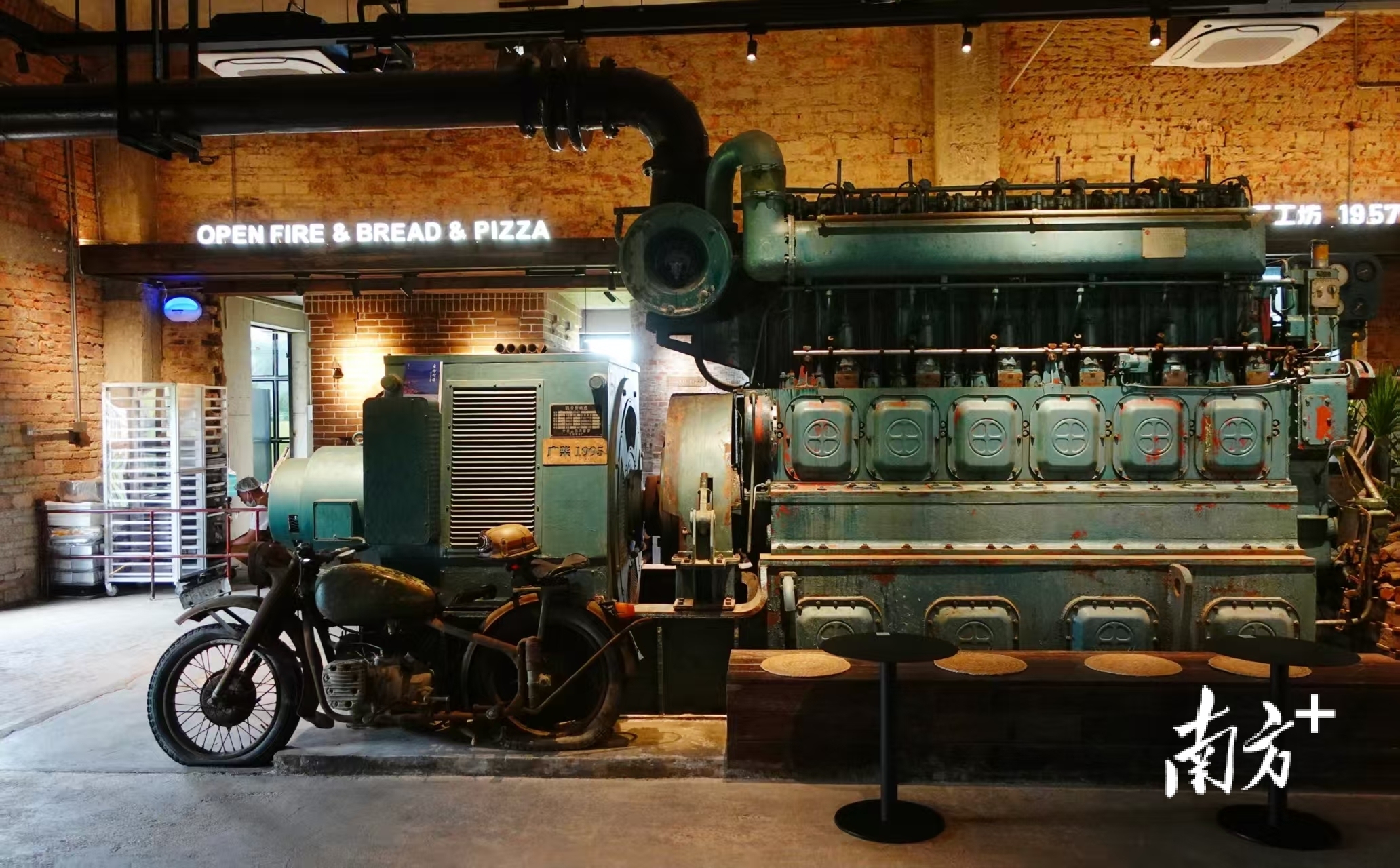 时至今日,走进简庐,6台锈迹斑驳的老式发电机依然被保留在店内,发黄的墙面、裸露的红砖、穿梭的钢铁轨道,与店内巨大的窑炉、复古壁灯、木质桌椅,完美地融为一体。