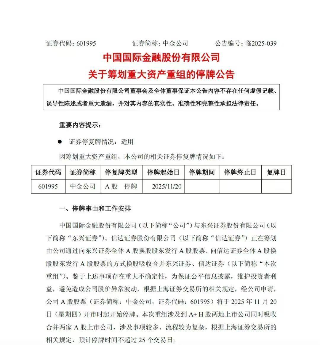 今日晚间,券商行业一则重磅消息落地——中国国际金融股份有限公司(简称 “中金公司”)与东兴证券股份有限公司(简称 “东兴证券”)、信达证券股份有限公司(简称 “信达证券”)三家券商同时发布《关于筹划重大资产重组的停牌公告》,筹划由中金公司通过向东兴证券全体A股换股股东发行A股股票、向信达证券全体A股换股股东发行A股股票的方式换股吸收合并东兴证券、信达证券。