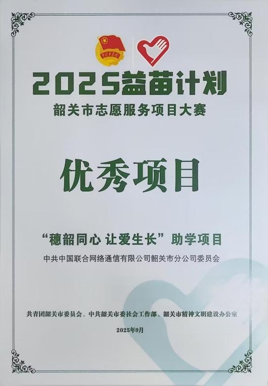 经过实践探索,韶关联通将项目经验提炼为可复制、可推广的轻量级方法论,系统地解决了乡村学生“有钱学、有物学、想学、能学、持续学”的系列问题,为乡村教育振兴提供了极具参考价值的“韶关样本”。项目连续获评数字乡村百强标杆村、中国联通志愿者优秀项目等荣誉,获得到当地乡村振兴局等单位的高度评价,并在前不久荣获2025年“益苗计划”项目大赛优秀项目称号,全市仅3项目获奖。