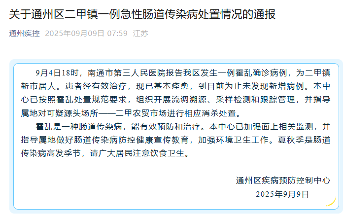 据通州疾控,9月4日18时,南通市第三人民医院报告我区发生一例霍乱确诊病例,为二甲镇新市居人。