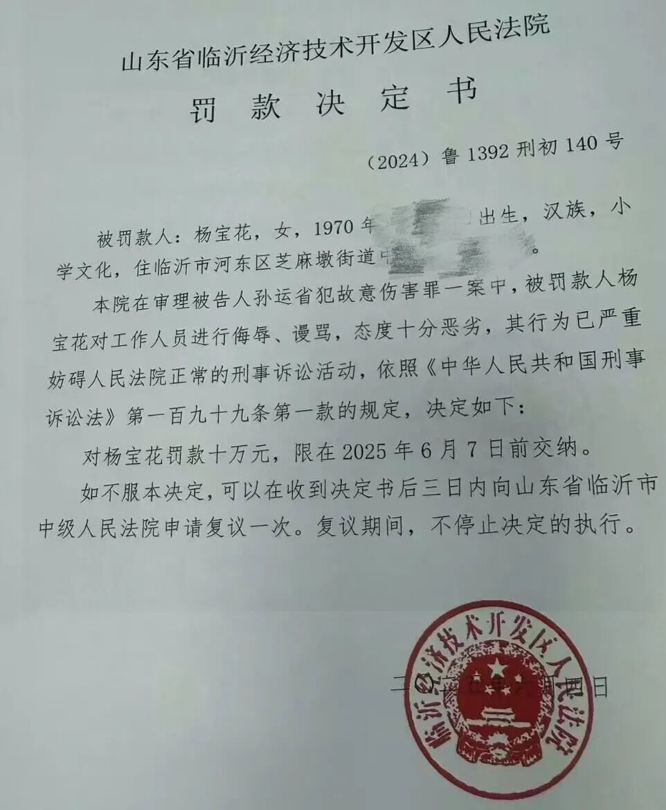 最终,临沂经开区法院决定,对杨宝花罚款10万元,同时对其拘留 15 日。