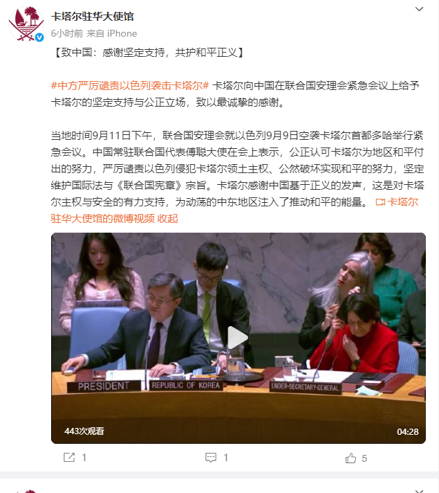 卡塔尔向中国在联合国安理会紧急会议上给予卡塔尔的坚定支持与公正立场,致以最诚挚的感谢。