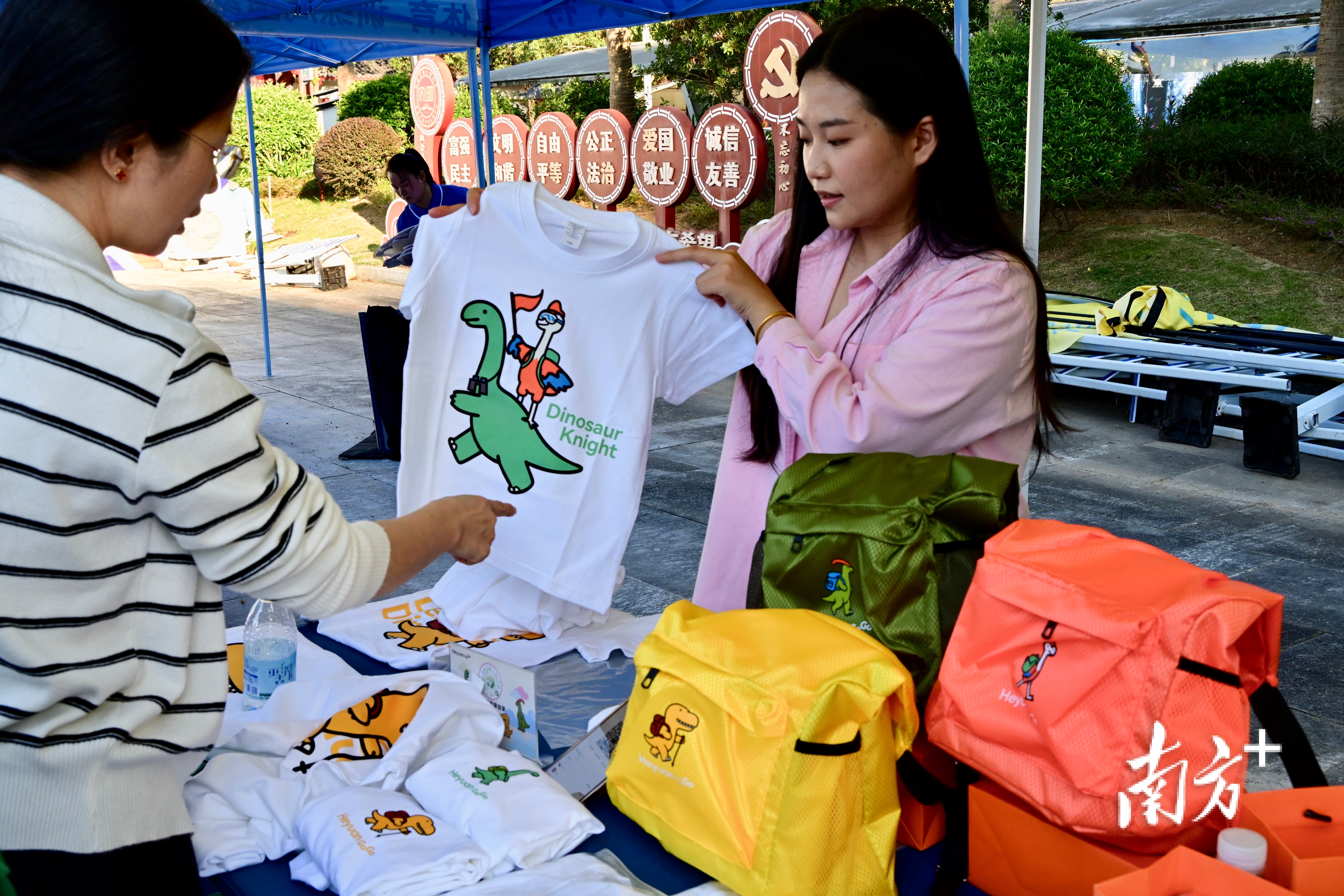 “穿越万绿湖”徒步活动现场,市民购买“四小龙”T恤。